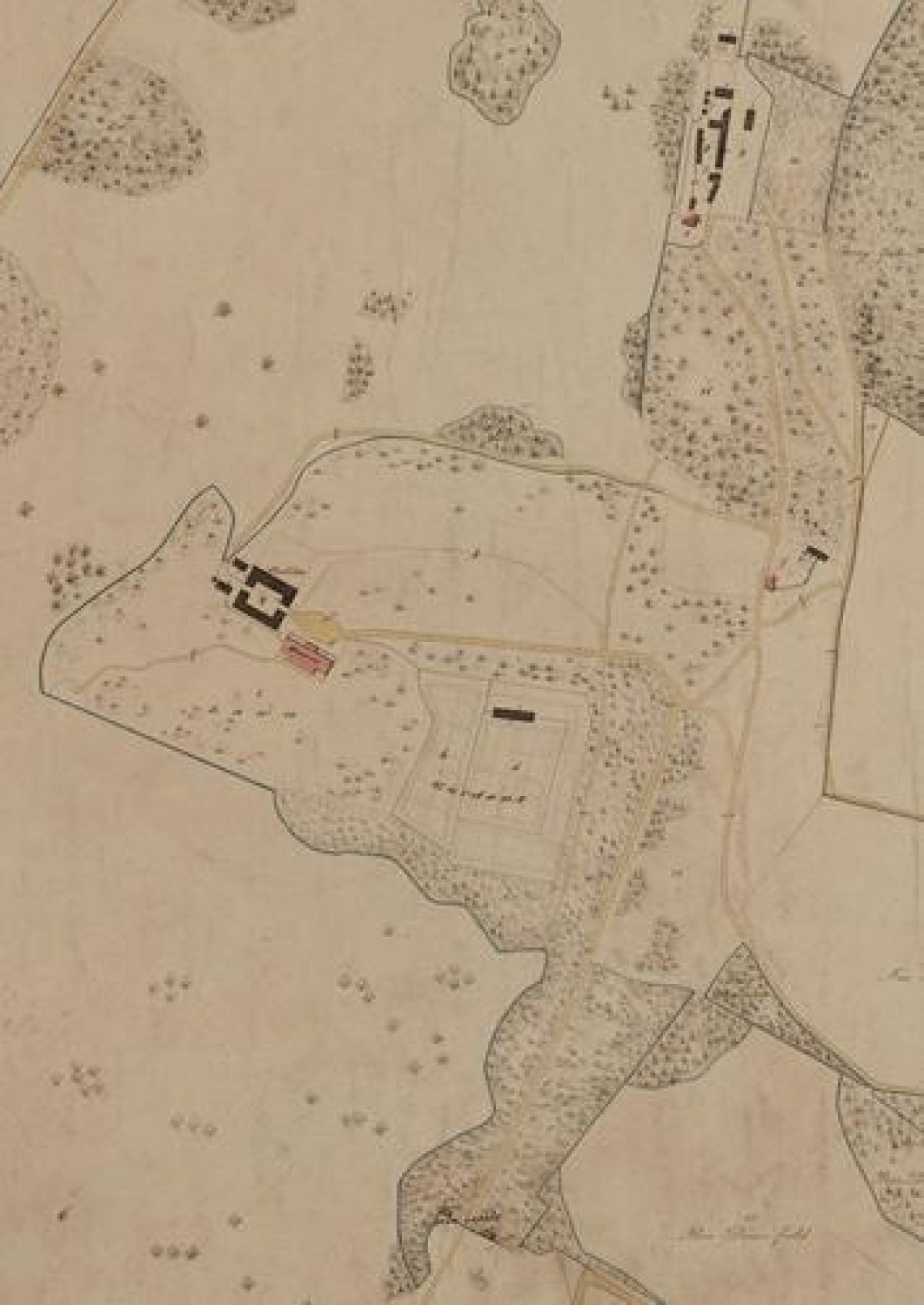The 1841 Tithe map for Madehurst shows that the estate was 1,870 acres, made up of the land around the house, the substantial double walled kitchen gardens, parkland, two farms, five lodges, cottages, a public house, and woodland. This would not have included the outlying portions of land.