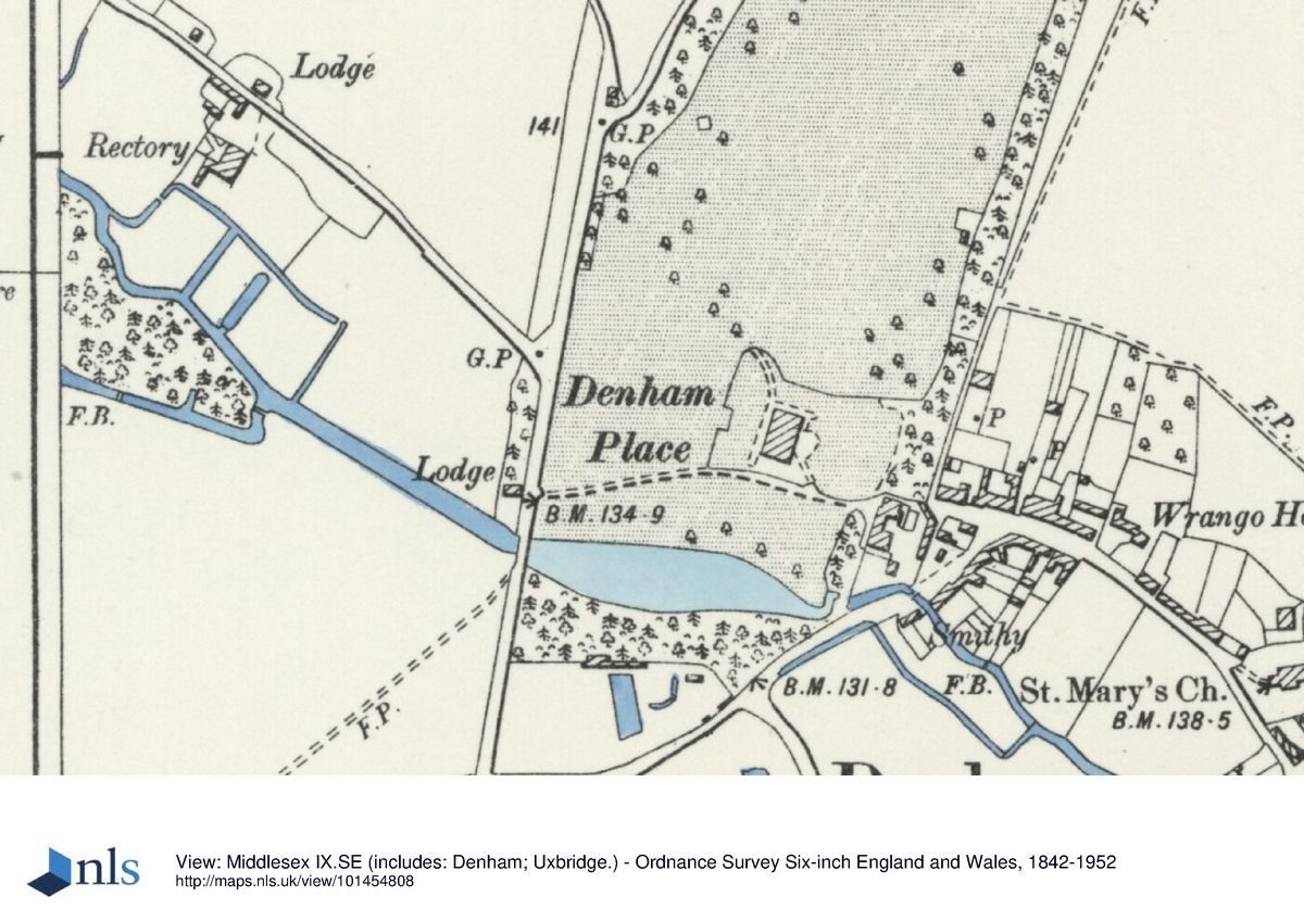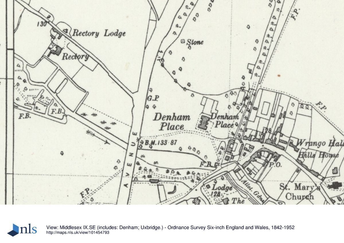 Denham Place lies 4km north-west of Uxbridge and 4km east of Gerrards Cross, at the west end of Denham's main street, Village Road, in the broad River Colne valley at the eastern end of the Chiltern Hills. The 17ha site is bounded to the west by the A412 Denham Avenue, to the south by Village Road running off Denham Avenue into the main street, and to the north and east by agricultural land and public footpaths. Much of the boundary is defined by a 1km long, 3m high C17-C19, red-brick wall (listed grade II), with a coping of vertically laid bricks raked to a point. This runs south from the north-east corner of the park, broken by occasional gateways, encircling the southern end of the estate and running north to just north of the road bridge over the River Misbourne on the west boundary. The site is largely flat, with a low rise running from west to east across the middle, north of the house, defined by fruit trees and modern conifers. The setting to the east is dominated by the adjacent village; the remainder is agricultural interspersed with small mid to late C20 settlements and busy trunk roads to the west and south. There are few views out of the estate as the area is largely visually self-contained.