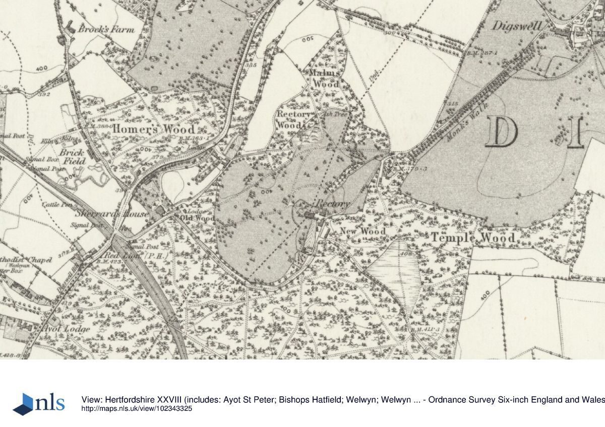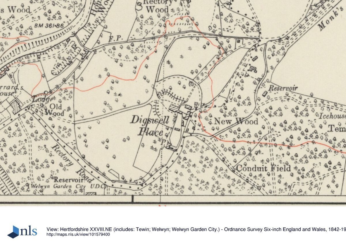 The wider parkland associated with the house has been divided into paddocks for horses although Malms Wood, Old Wood and Rectory Wood survive from the earlier historic planting. Earthworks showing the former position of the Great North Road (moved in 1830) can be seen. The historic planting belt between Digswell Place and Digswell Park Farm, of monkey puzzle, cedar, ash, thorn, larch, oak and sweet chestnut, survives in part.