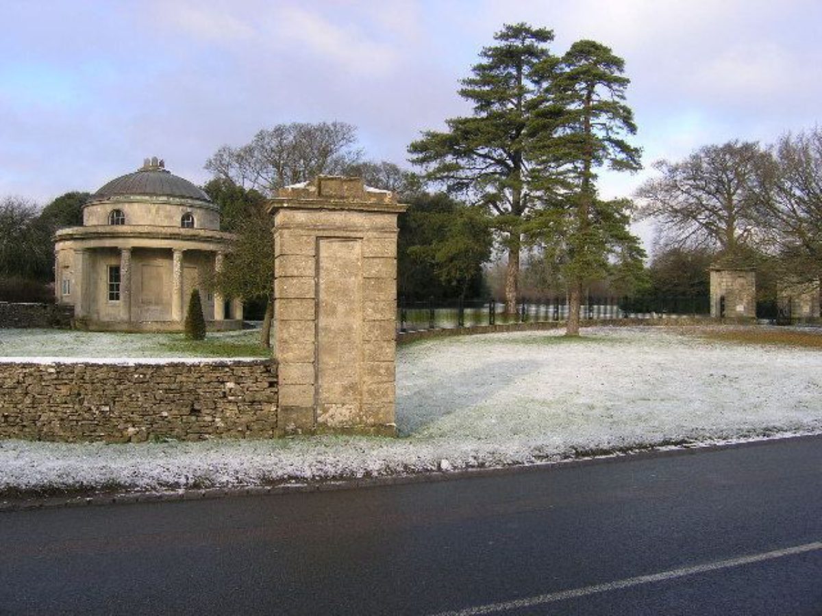 The principal approach to the House descends from the Bath to Stroud road, entering the park some 1.5km south-south east of the House via two massive rusticated gate piers, set in the centre of a 90m wide semicircle of cast-iron railings (piers, dwarf wall, and railings early C19, listed grade II), at the southern end of which stands James Wyatt's Bath Lodge (1796-1816, listed grade I), a circular Tuscan tempietto with a shallow dome. The approach leads north-west through a perimeter belt and Dodington Wood before descending a long S-curve down the scarp, straightening out as it turns north into a shallow valley to obtain a composed view of the House at the northern end standing beside a lake, with a hanging wood and standard parkland trees on the east side. It then runs along the west side of the valley, with further views framed by large beech, oak, and lime, to a forecourt on the west side of the House. Brown's composition originally included a lake south of the existing south lake, to create the impression of a serpentine river in this view.