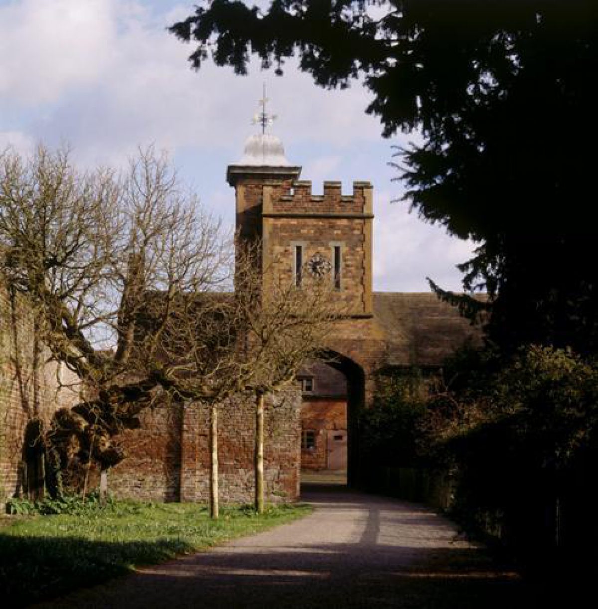 The main approach is via the gate off the A442 at South Lodge (listed grade II), a mid C19 two-storey red sandstone building with gothic detailing and spirally moulded brick chimney stacks. From here the drive runs on a slightly curving line west across the open, level parkland either to the Hall's east forecourt or to the public car park in the southern part of the walled garden complex.