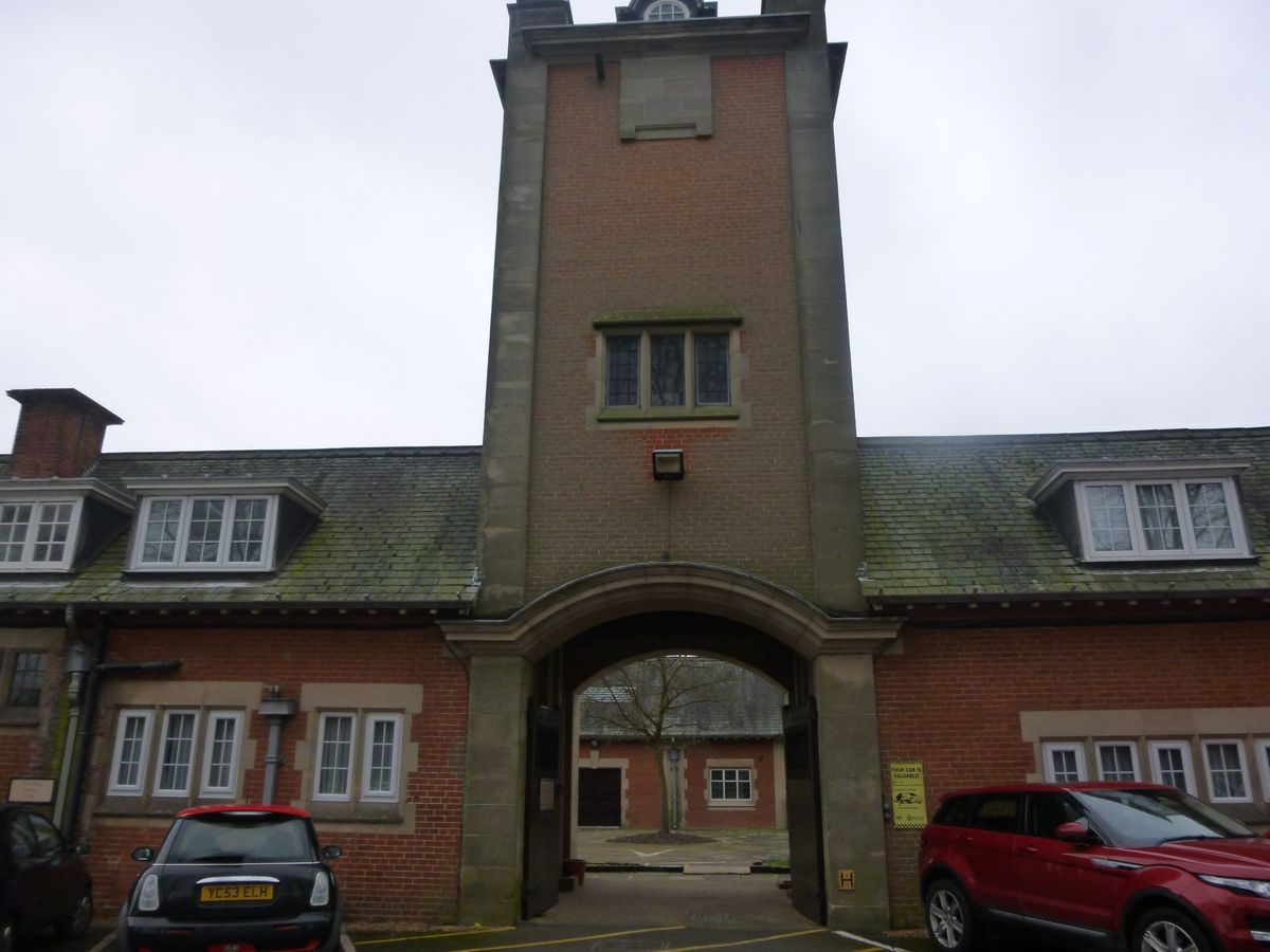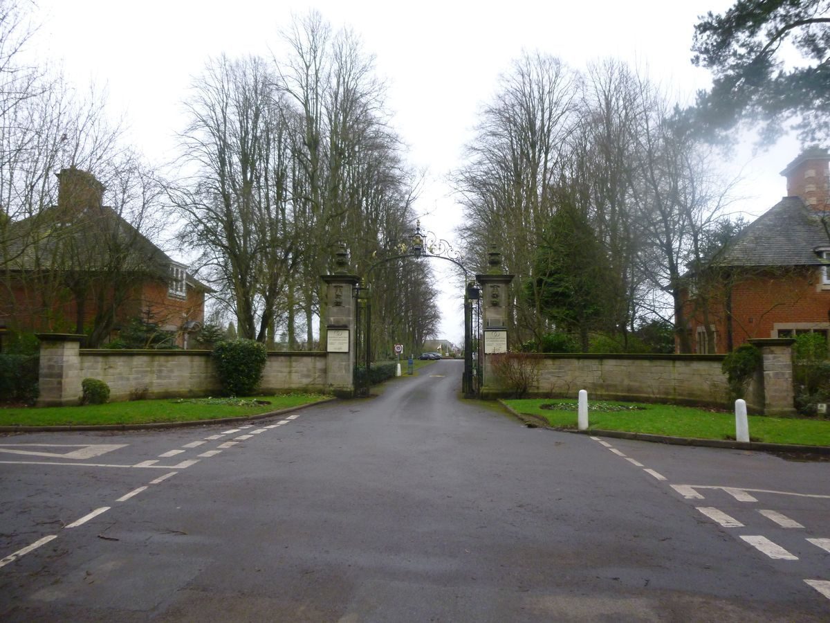 To the south-east of Vicarage Lane the drive enters the grounds immediately adjoining the house through a pair of elaborate early C20 wrought-iron gates with an ornamental overthrow, which are supported by stone piers ornamented with carved swags and vase finials (listed grade II). The piers terminate low, stone, concave wing walls which stand behind quadrant lawns. Within the site and to the north of the drive stands Inner Lodge (listed grade II), an early C20 brick and stone structure with attic dormers set in holly-hedged gardens. Proceeding on a level, straight course the drive passes south-east through a double avenue of limes for c 130m to reach the north-east facade of the stable court which stands to the south-west of the drive. Beyond the stables the drive drops gently and sweeps east and south-east through banks of mature shrubbery and specimen trees to reach the carriage court to the north-east of the house. The carriage court is enclosed to the east, south-east and south by low brick walls with stone balustrades and coping, and to the north-west by the single-storey brick and stone dining room which was built in 1950. Openings to the south and east lead to steps which descend to the garden terraces, while a further opening to the north-east leads to semicircular steps which descend to an avenue extending c 130m north-east. This avenue is today (1999) planted with mixed ornamental trees, replacing an early C20 planting of elm which, as a result of disease, was felled in 1979. Today the carriage court has a central area of tarmac surrounded by planting beds. Early C20 photographs show that the carriage court was entered from the drive to the north through a pair of elaborate wrought-iron gates with an overthrow supported on square stone piers. A similar gate screen with a pedestrian gate stood at the south-east corner of the carriage court and both sets of gates and piers were given to the Borough of Rugby in 1950 when the north gate was removed to make way for the dining room. The northern gates were moved to Caldecott Park, Rugby; the whereabouts of the south-east gate is unknown.