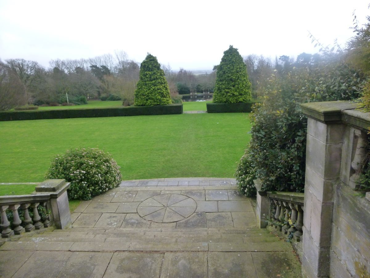 Centrally placed stone steps (listed grade II) descend from the upper terrace to a flagged landing on a narrow grass terrace which connects at its eastern end with a walk which ascends to the Sun Dial Court. From the grass terrace splayed stone steps flanked by stone ball ornaments descend to the tennis lawn which is enclosed to the east, south and west by yew hedges. To the east and west of the tennis lawn narrow yew-hedged enclosures, now (1999) laid to grass but formerly with herbaceous borders flanking a grass walk (Mawson 1926), have apsidal ends, originally closed but now opening onto walks leading into the pleasure grounds. From the tennis lawn semicircular stone steps (listed grade II) aligned on the central axis of the house and terraces, and flanked by specimen golden conifers, descend to the informal pleasure grounds. These comprise a south-east-facing sloping lawn, with groups of ornamental trees and shrubs arranged to the north-east and south-west of the central vista, which leads down to an elliptical lake c 130m south-east of the house. To the south of the lake a belt of trees underplanted with rhododendrons and azaleas is separated from the water by a grass walk, while on the central axis of the garden stone steps (listed grade II) flanked by balustraded recesses ornamented with stone obelisk finials descend to the water. A summerhouse to the south of the lake, and formal hedges framing the lake to the south, east and west which are shown on Mawson's published plan of the gardens, were not implemented (Mawson 1912, 1926). Beyond the lake to the south-east, and screened by a belt of woodland, is a further, natural pond which was intended to be accompanied by a rock garden (Mawson 1912, 1926); this was not executed. The gravelled perimeter walk describing a figure of eight around the lawns and pleasure grounds does not survive, although its course can be traced in the lawn (1999).
