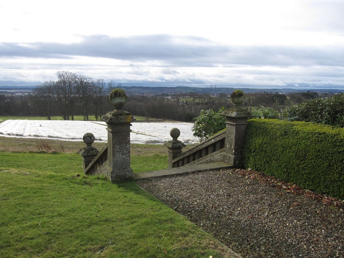 The policies of Duntrune House remained in the ownership of the Ovenstone family for most of the 20th century. The fine rhododendron plantings which are a feature of the early summer garden were planted by the present owners, who replaced many R.ponticum bushes. These species may have overgrown Victorian plantings of rarer rhododendrons made by the last Stirling Grahams, Clementina or her nephew John Edmond Lacon. Other features of the 20th-century garden, no longer in existence, are tennis courts to the west of the house (shown as a rectangular enclosure on the Second Edition Ordnance Survey maps), and a rustic summerhouse on the ha-ha, shown in a photograph album of the Ovenstone family. The walled garden now contains two modern houses, one with attractive maturing plantings of native and other species of trees and shrubs. Extensive lawns surround the mansion house, with herbaceous planting at the foot of the house walls and climbing shrubs on the walls themselves. A new orchard of old Scots varieties of apples has been planted. The panoramic view from the ha-ha continues to be an outstanding feature of the garden. The policies of Duntrune House might well still be described as Ochterlony wrote, a fine place with parks and meadows about it, despite the evident agricultural developments and the urban sprawl of the city of Dundee.