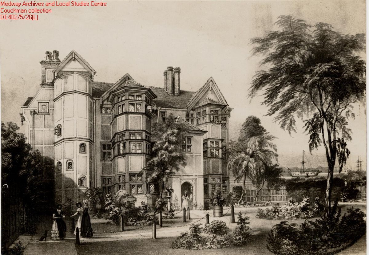 Evidence of a late Tudor, early Jacobean garden is speculative, but between 1608 and 1612 Eastgate House appears to be shown with a substantial enclosed garden immediately beyond which lies marshland and the river Medway (John Speed map 1608-12).
