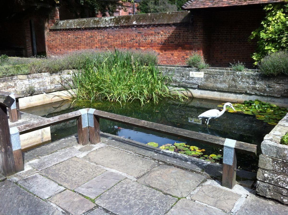 Beyond the former lawns, to the north-west of the entrance, lies an area paved with some 500 square metres of York stone surrounding two T-shaped ponds planted with water lilies and water iris. The ponds, connected by a water channel beneath a stone bridge, form the focal point of the garden. They replaced Dawber's original sunken octagonal pond. The first pond, to the north-east, is 54m square and is surrounded on three sides by a stone wall, around 45cm high and varying in width, containing lavender beds. Open post and rail fencing forms a barrier on the fourth side. Two rectangular box parterres containing box topiary, lavender and pelargoniums flank this pond; the first to the south-east is 2.5m wide and 6m long and the second to the north-west 3.5m wide and 6m long.