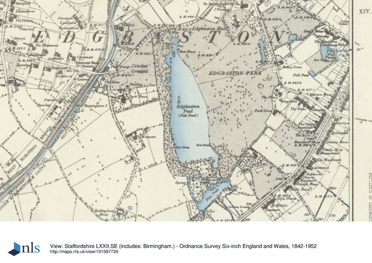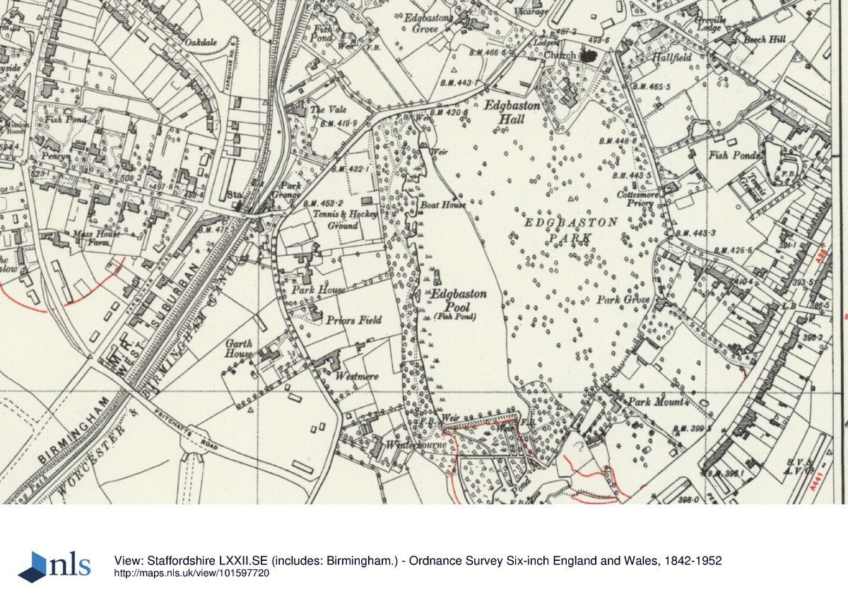 A map of 1701 shows that already by that date the 19 acre (c 8ha) tongue of land running south from the Hall was denoted Little Park. By 1718 the Great Pool was in existence, with Blade Mill Pool to the south, and in 1719, two years after purchasing the Edgbaston estate, Sir Richard Gough inclosed Edgbaston park and stocked it with deer. Beighton's view of the Hall and its surrounds c 1730 (in Dugdale 1730) shows an avenue approaching the south-east front, from the park. Lancelot Brown (1716-83) sent Sir Henry Gough 'plans for general alterations' (Stroud 1975, 224) in January 1776. Quite what these were is unknown, and hence the extent to which the C19 and C20 landscape was moulded by him. A map of 1787 showing the Great Pool and individual parkland trees, suggests however that any changes were probably superficial. The only substantial, and undated, C18 alteration was the closure of Priory Road c 400m south-east of the church; in 1701 this had continued around the south-east corner of the park. In the later C18 the demesne and park extended to 101 acres (c 42ha).