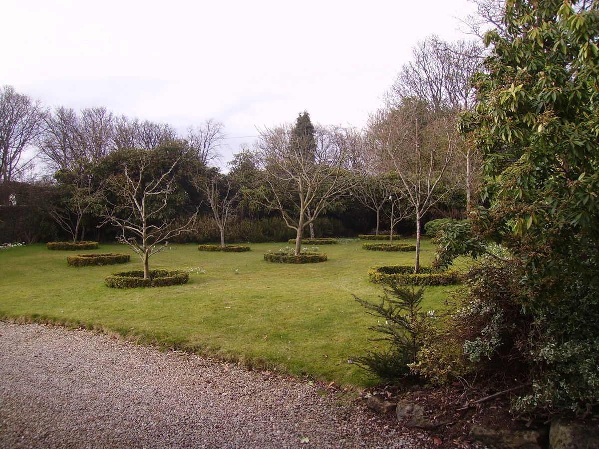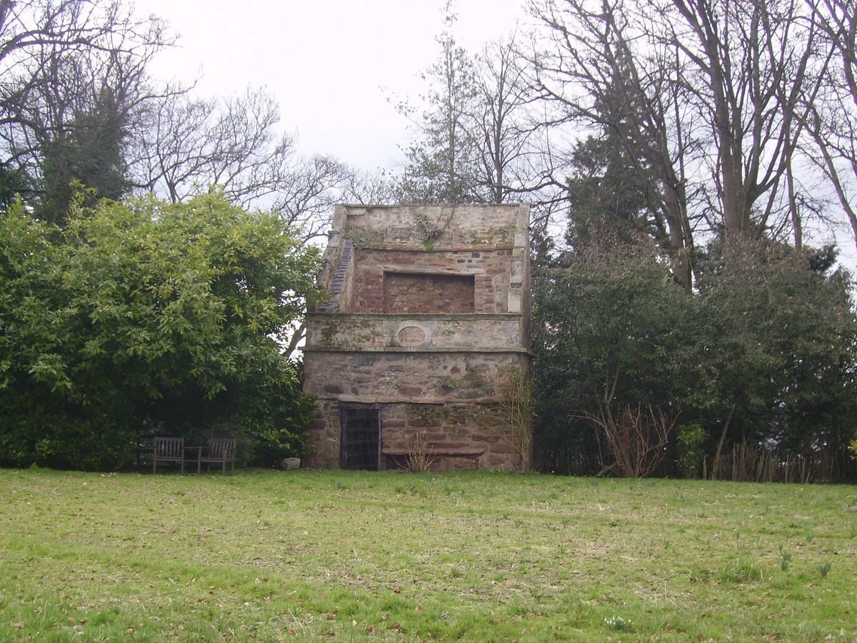 The circular turning area in front of the house is shown on the 1853 Ordnance Survey. A great many formal pathways and flowerbeds are marked, along with many new trees and shrubs. The walled kitchen garden to the east is laid out with small trees in rows - perhaps an orchard- with a pathway round its perimeter and a small summerhouse in the centre. A Sundial is marked due east of the house and a pump to the south (where a well was uncovered in 1968 when a tree blew over). The Steading in the south-west corner of the policies has been removed. The Stable block and Lodge house are shown.