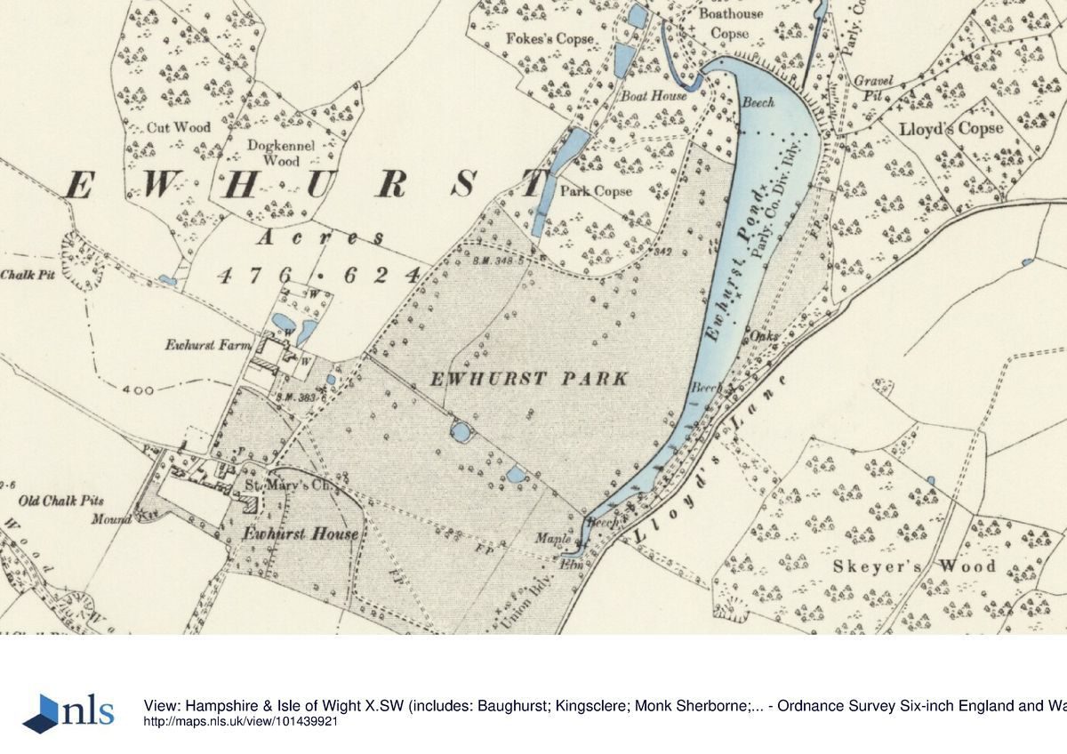 From 1817 to 1943 the Dukes of Wellington were the principal land owners in Baughurst. From the 1810 map it's clear that Ewhurst mansion house stands in an extensive park The tithe map of 1843 shows a formal pleasure garden enclosed by walls of stable yard and kitchen garden. The layout is little changed in the later OS map of 1872. A little to the north of the house is the parish church. The mansion house and church were rebuilt in 1872-3 by Mr. W.H. Chichele Plowden.