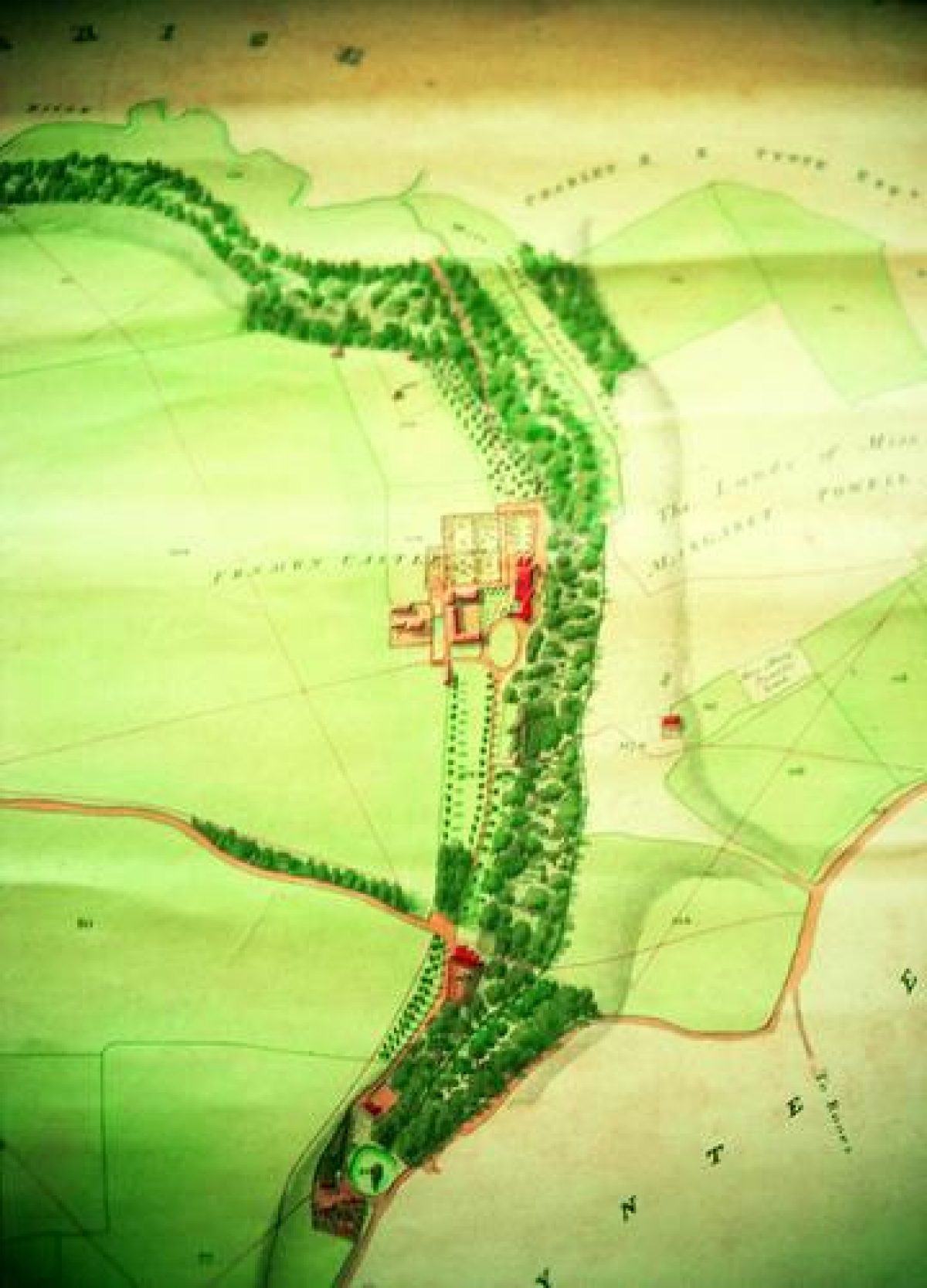 A tithe map of 1840 also shows stables to the south-west of the castle. The ha-ha, which runs south from the stables, is thought to date from the late-18th-century. The main drive was diverted to the west some time before 1878. Having previously run to the south façade, it now ran to a new main entrance on the west side. At this time, a new retaining wall was constructed at the east side of the garden.