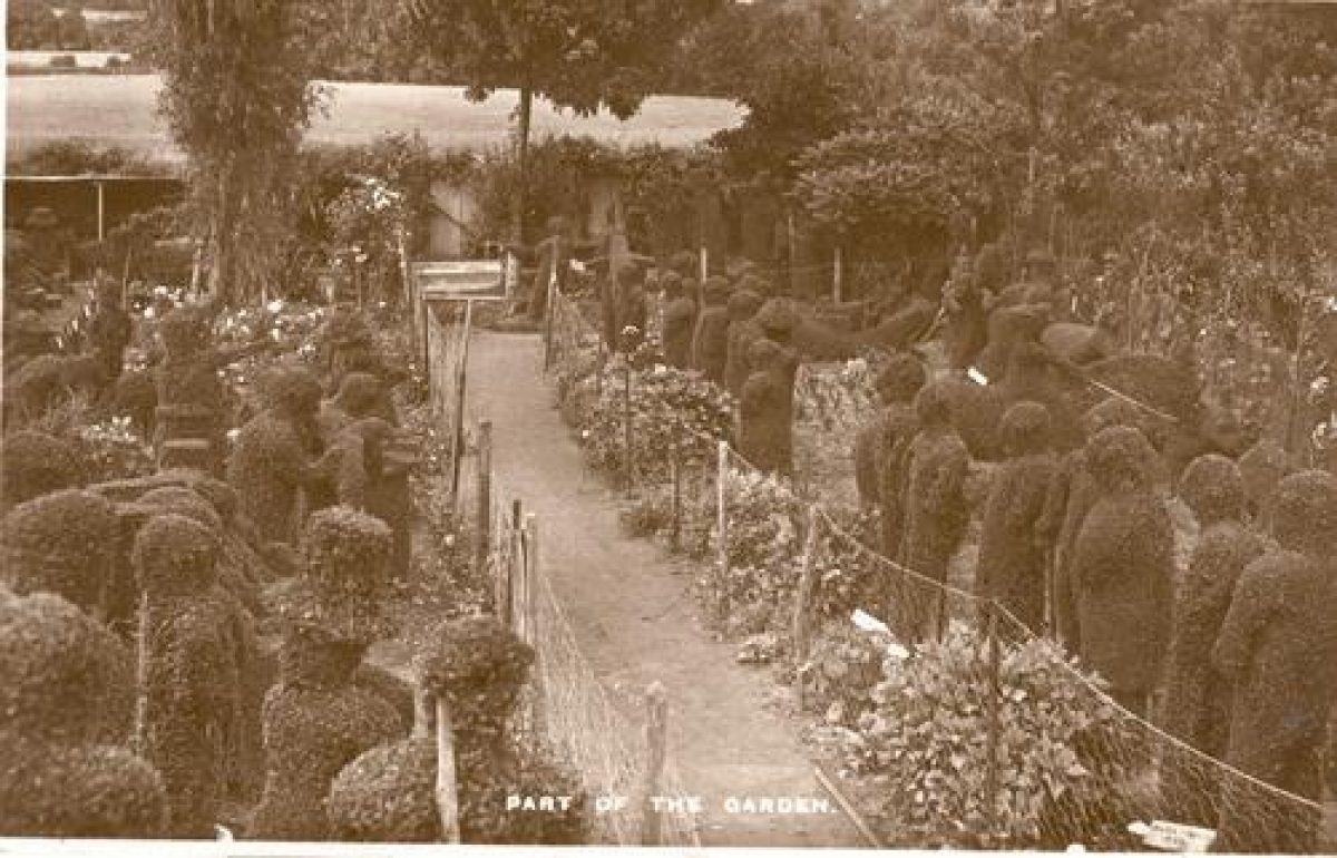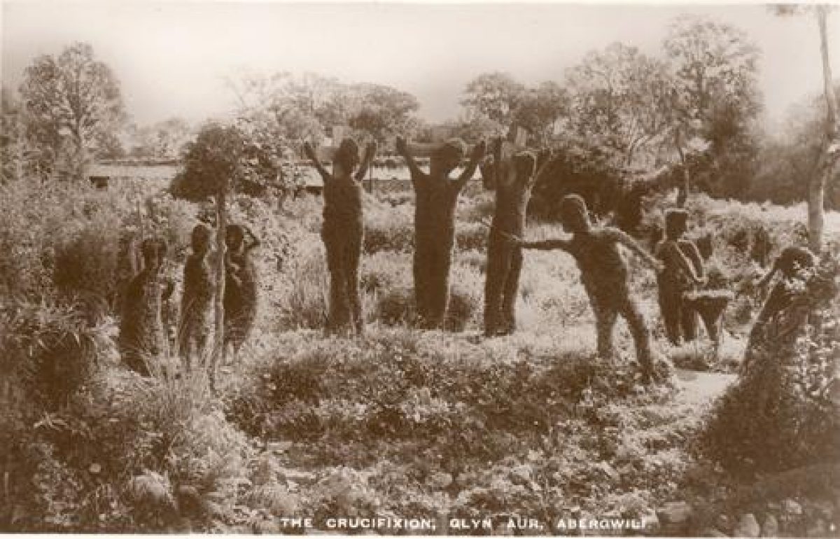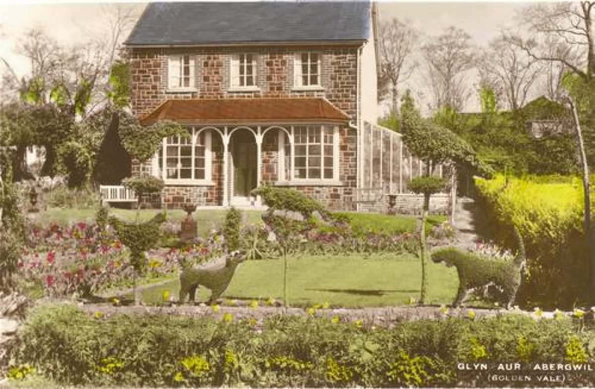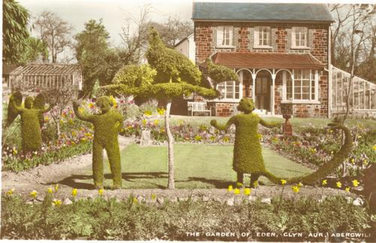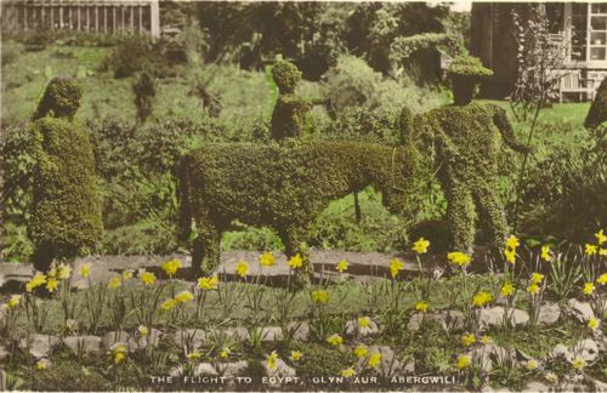 Glyn Aur was a cottage garden with extensive topiary, much of it representing biblical figures and events. It was sometimes known as the Garden of Eden. The garden was open in its heyday but is now sadly lost. There are, however, a number of old postcards based on photographs taken by the then owner, which show the full glory of the topiary.