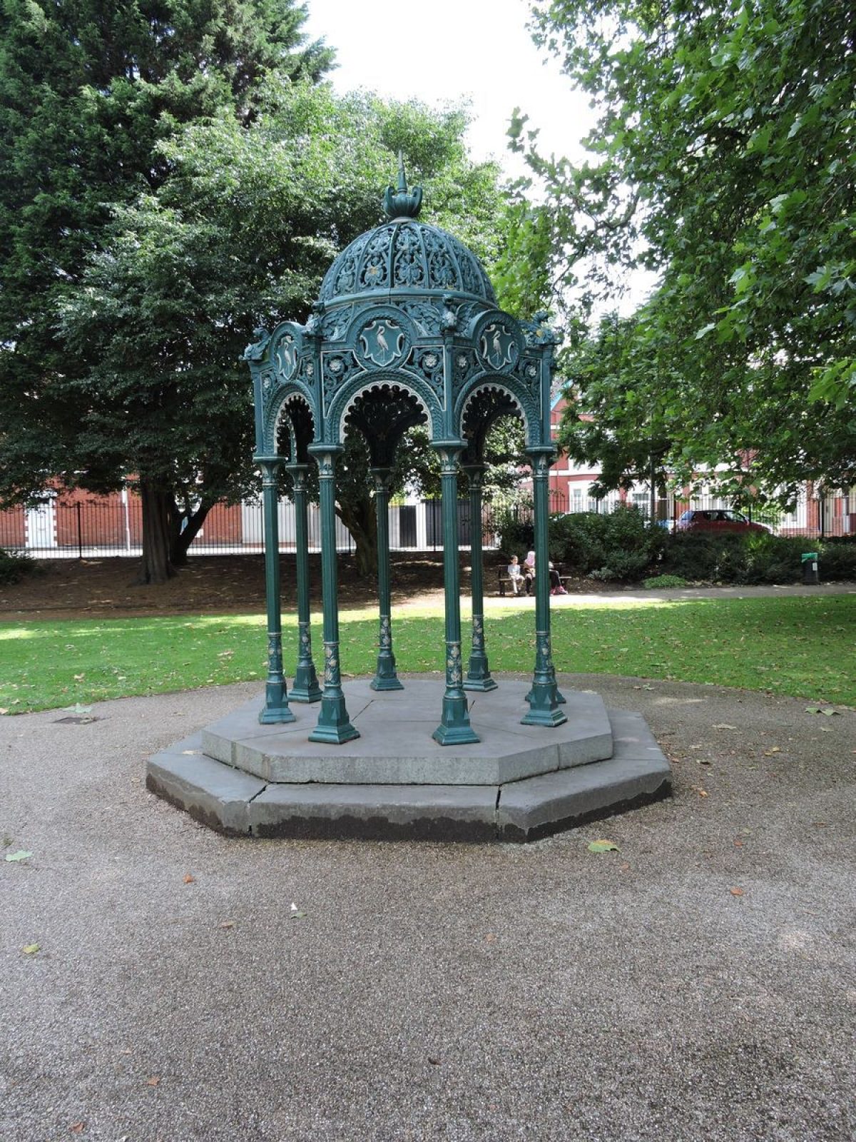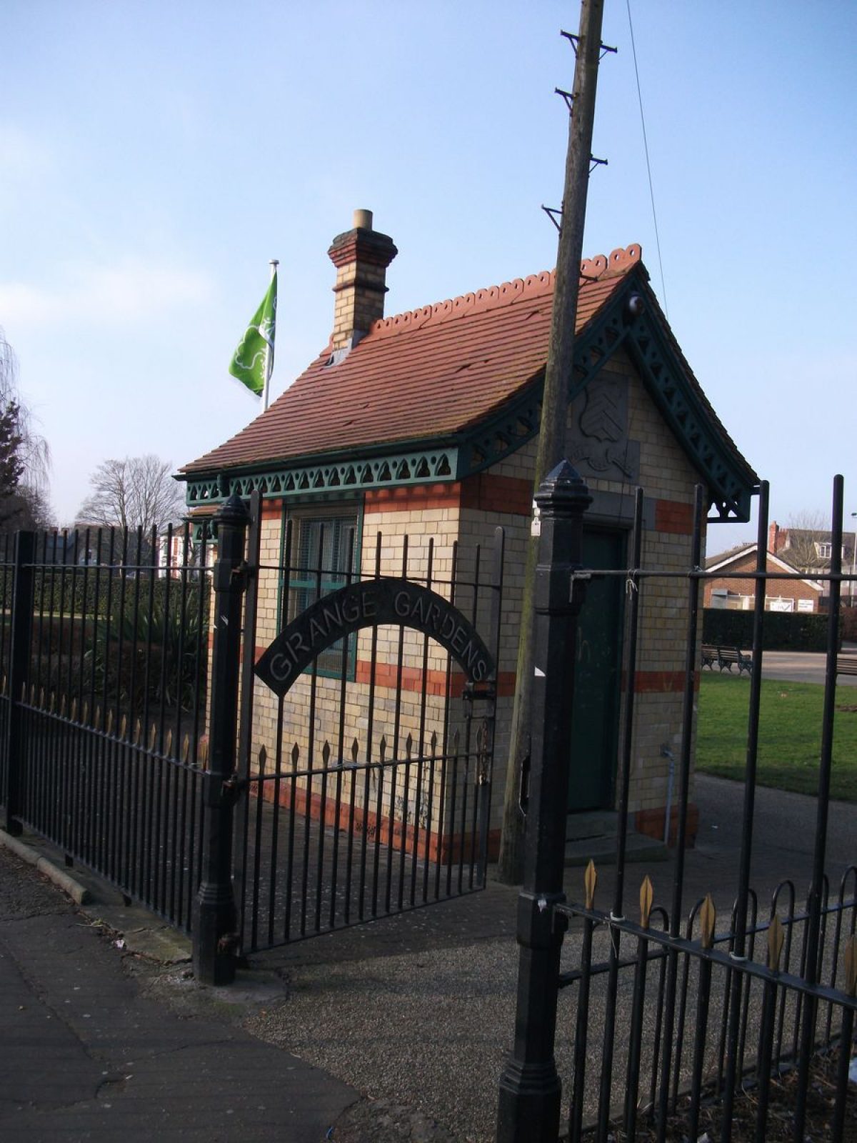 Grange Gardens is a small urban park created on land donated by Lord Windsor and Lord Bute. The area was raised with suitable 'scavenged' material and the park opened in 1895. It included a bandstand and park attendant's hut, which is still extant. The original bandstand is believed to have been removed during World War 2. A bowling green and tennis courts were constructed and opened in 1906. The area formerly occupied by the tennis courts in now a floodlit play area. In 1909 a drinking fountain was installed in memory of Louis Samuel and was also probably removed during World War 2. By the end of World War 1 a children's playground had been added. A war memorial (Grade II listed) was officially unveiled on the 7th July 1921. The park was awarded Heritage Lottery funding for restoration works which were completed in 2000 and included installation of replicas of the bandstand and the fountain canopy. A rustic shelter (Grade II listed), which apparently was built in the early 1920s, is to be found on the corner of Corporation Road and Holmesdale Street, the entrance being outside the park enclosure.