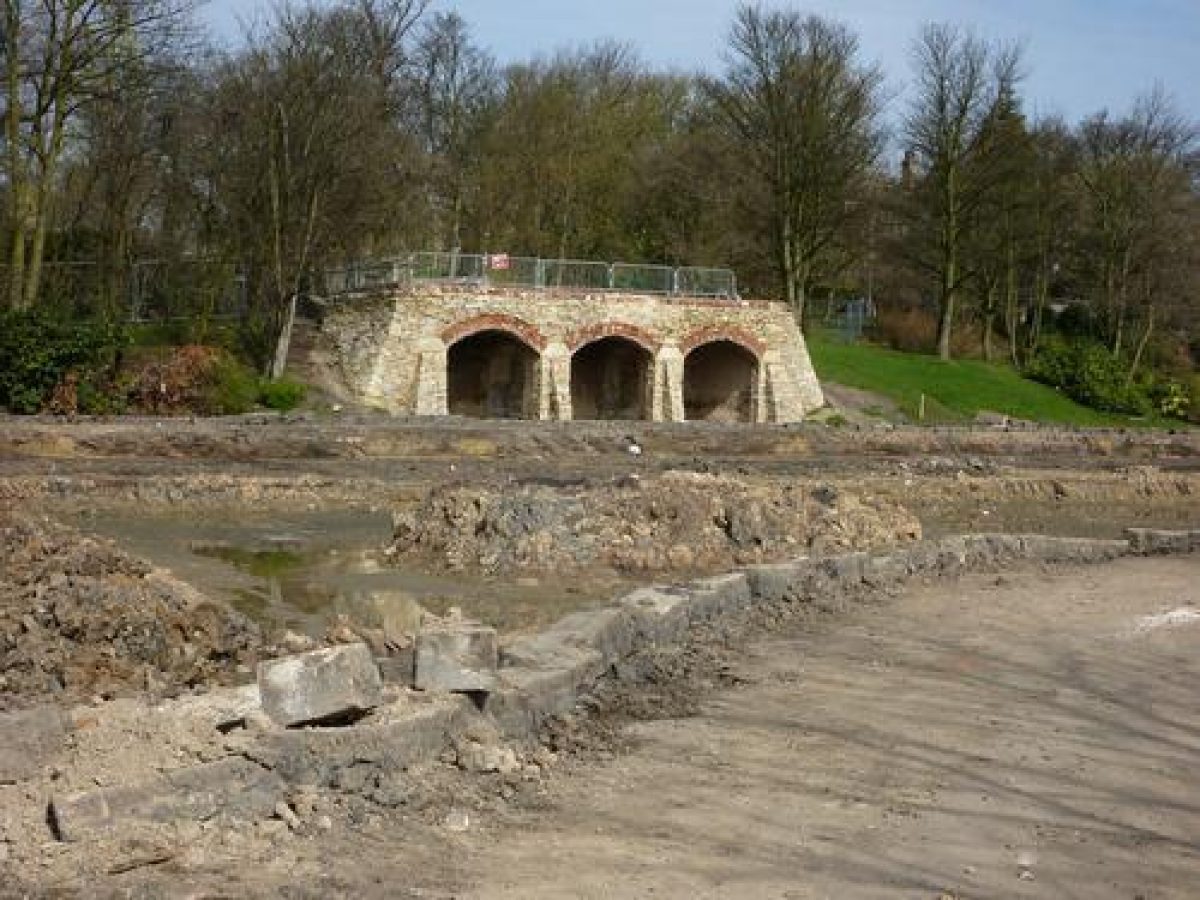 In 1882, the perimeter road around the park, Park Drive, was set out. Work began in 1883 on the laying out of the park itself under the direction of the Borough Surveyor, Mr Dugdales, and it was formally opened to the public in September 1884. By 1890 (OS) most of the site had been laid out and the majority of the park's distinctive elements had been established. Prominent features included the principal east/west path, which terminated in the monumental, two-sided promenade terrace, and the five fishponds, bridges, and arbours. The timber bandstand on its stone platform, and the stone fountain basin in the Italian Gardens were also in place.