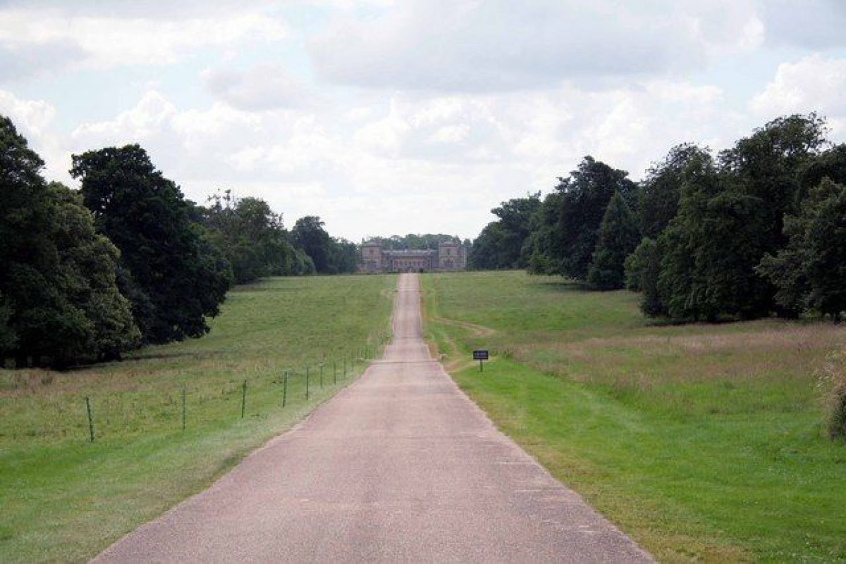 The present (2000) approach to the Castle is from the A151 to the north along the North Avenue. This replaces the entrance from the village of Grimsthorpe north-east of the Castle, which is marked by the limestone rubble and Collyweston slate Lodge Cottage (listed grade II). The drive, which runs south-east to the north-west front, was created to mark Queen Victoria's Jubilee in 1897. On the Kip and Knyff engraving of 1715 this approach is shown as a wide single avenue leading from an ornate gate at the north end. By 1745 it had become a double avenue of oak (Tycho Wing map).