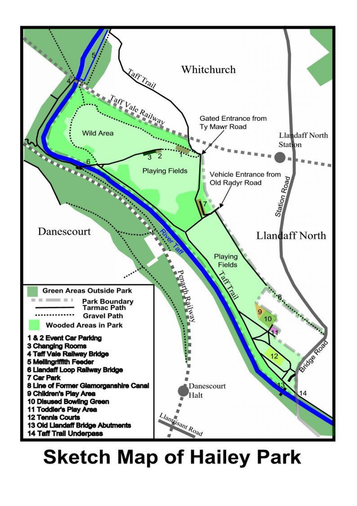 Hailey Park comprises about 19 hectares of land bordered to the west by the River Taff, to the north by the Taff Vale Railway, to the east by the built-up area of Llandaff North and to the south by Bridge Road. At the southern end of the park there are tennis courts, a toddler's play area, a (disused) bowling green and a children's play area. North of this are two areas of playing fields separated by the Taff Trail. North of the playing fields there is an area for wild life designated as a Site of Importance for Nature Conservation. At the northernmost end of the park is the five-arched Taff Vale Railway Bridge over the River Taff, designed by Isambard Kingdom Brunel.
