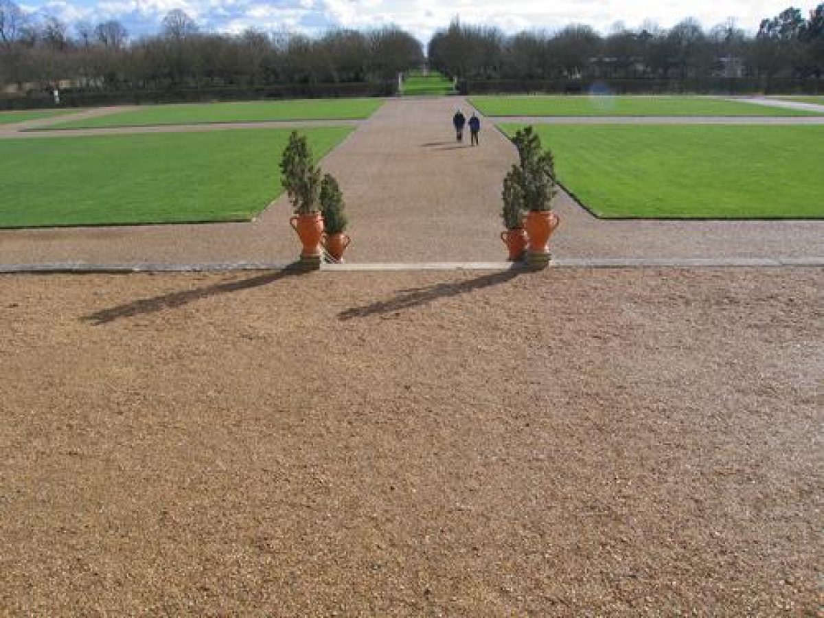 The gravelled south terrace, which runs between the east boundary wall and the wall of the Rose Garden to the west, is supported by a brick wall capped with coping stones topped at intervals with terracotta urns. The border below the terrace is planted out with herbs. Three flights of C19 steps lead south down to eight grass plats divided with gravel paths; these were reinstated during the 1975 restoration. Full-height iron railings, through which the Melancholy Walk and distant Richmond Hill can be viewed, pierce the boundary wall at the eastern end of the south terrace. To the north of the western end of the terrace, the south wall of the west courtyard provides the boundary, with herbaceous borders at the foot of it. Access to the west courtyard is through a doorway at the eastern end of this wall. Views extend south from the terrace across the plats to the Wilderness, and beyond along the main axial view to Ham Common in the south and the Melancholy Walk to the east.