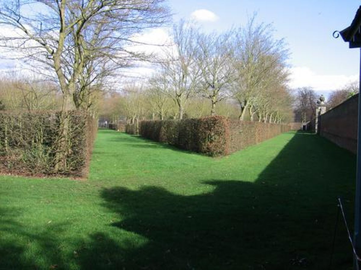 The grassed area to the north of the Ilex Walk is bordered to the east and west with beds containing roses. A mature horse chestnut survives to the south-east, and two ornamental trees enclosed within iron railings grow near the orangery. Field archaeology (see Mees 1993) and parchmarks reflect the buried remains of circular beds, and the sites of trees and paths recorded on the OS 1st edition map (1868). A connecting doorway is set in the northern end of the boundary wall, between the Rose Garden and the plats.