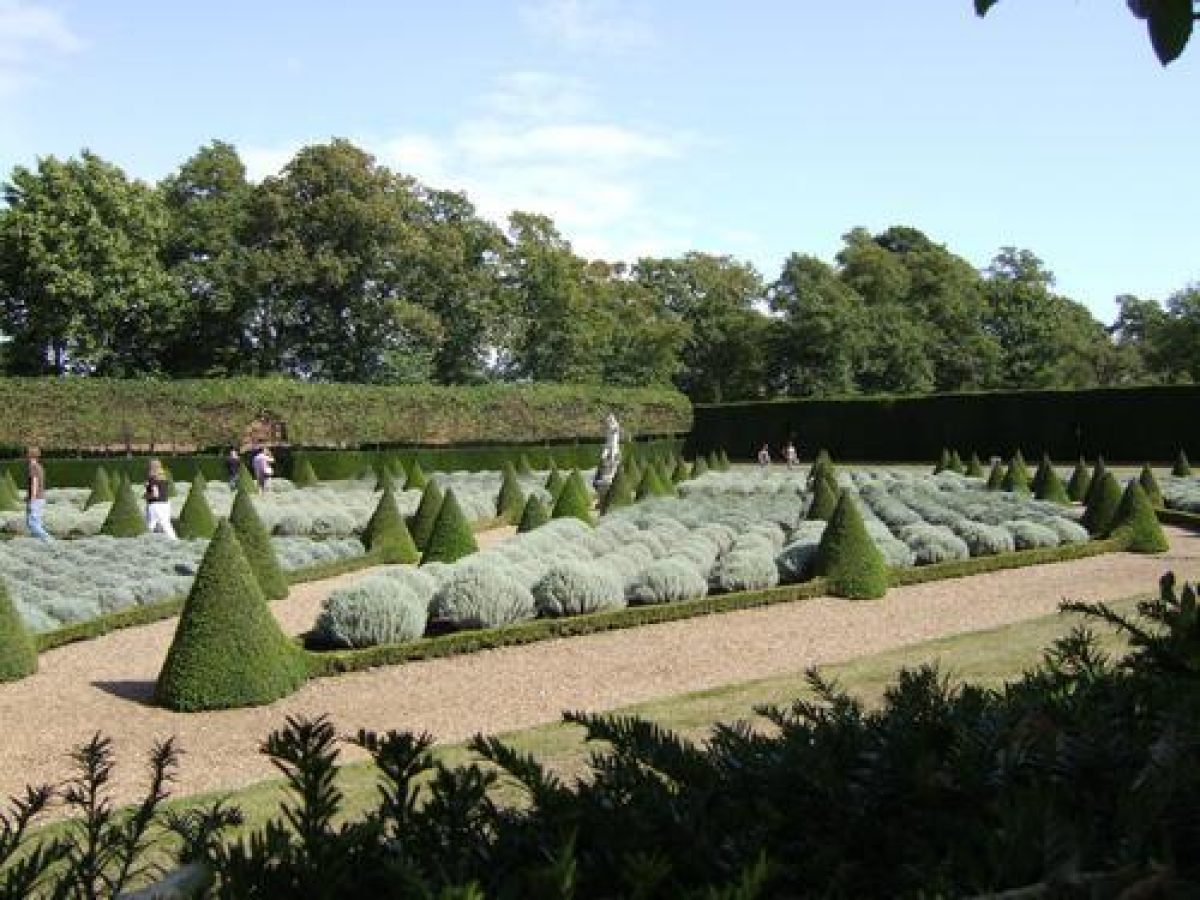 To the east of the forecourt on the north side of the House lies the Cherry Garden; it is not known why this name has been attached to the area. Robert Smythson's plan of 1609 identified it as the Principal Garden, but there are no design details included. The garden was replanted in 1975, a 1671 design by Slezer and Wyke (probably unexecuted) being used as a model. This plan shows a design of diamond-shaped beds and these have been executed in low box hedges with small pyramidal yews at intervals and at the corners. The shape is filled with either lavender or santolina and gravel paths separate the beds. Gravel paths and yew hedges enclose the Cherry Garden and hornbeam tunnel arbours to the east and west lead to the south terrace. The space between the western tunnel arbour and the rear of the eastern curved wall of the forecourt is made up as an herbaceous border. The Cherry Garden is screened from the south terrace along the south front of the House by tall yew hedges which are separated by a gravel path. The path leads from steps on the east side of the House to the east wall where, it is thought, there was a clairvoie out onto the Melancholy Walk.