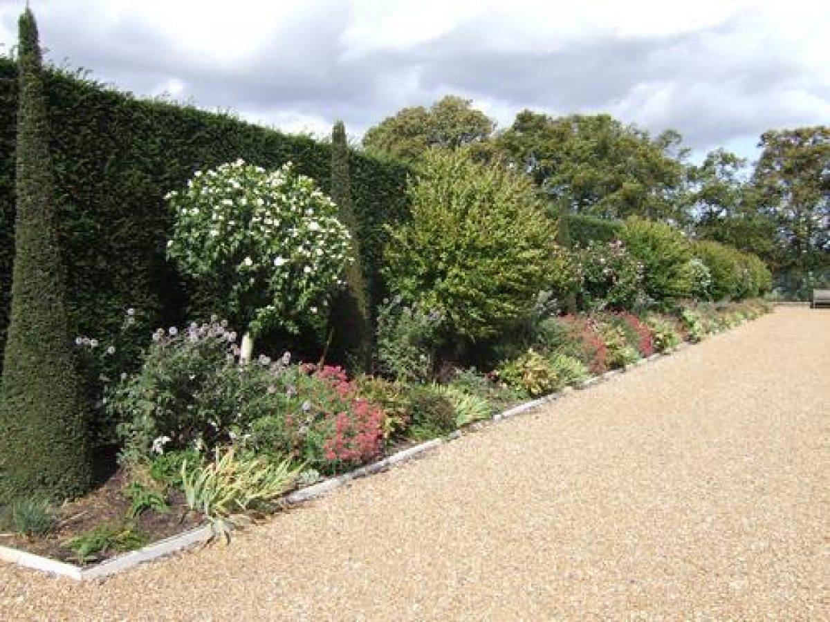 The Rose Garden is not strictly rectangular: the west boundary wall cants slightly to the west and possibly reflects the enlargement of the area recorded on the OS 1st edition map of 1868. By 1897 (OS) the Rose Garden had been reduced in size and enclosed with a wall to the south. The Rose Garden now (1997) has peripheral gravel paths which meet up with the east /west path from between the plats and the Wilderness. This path, the Ilex Walk, continues the width of the garden and a statue base is set in the centre of the path half way between the gate and the west wall. A small yard for the gardeners is set in the south-west corner. The remaining part of this area is privately owned.