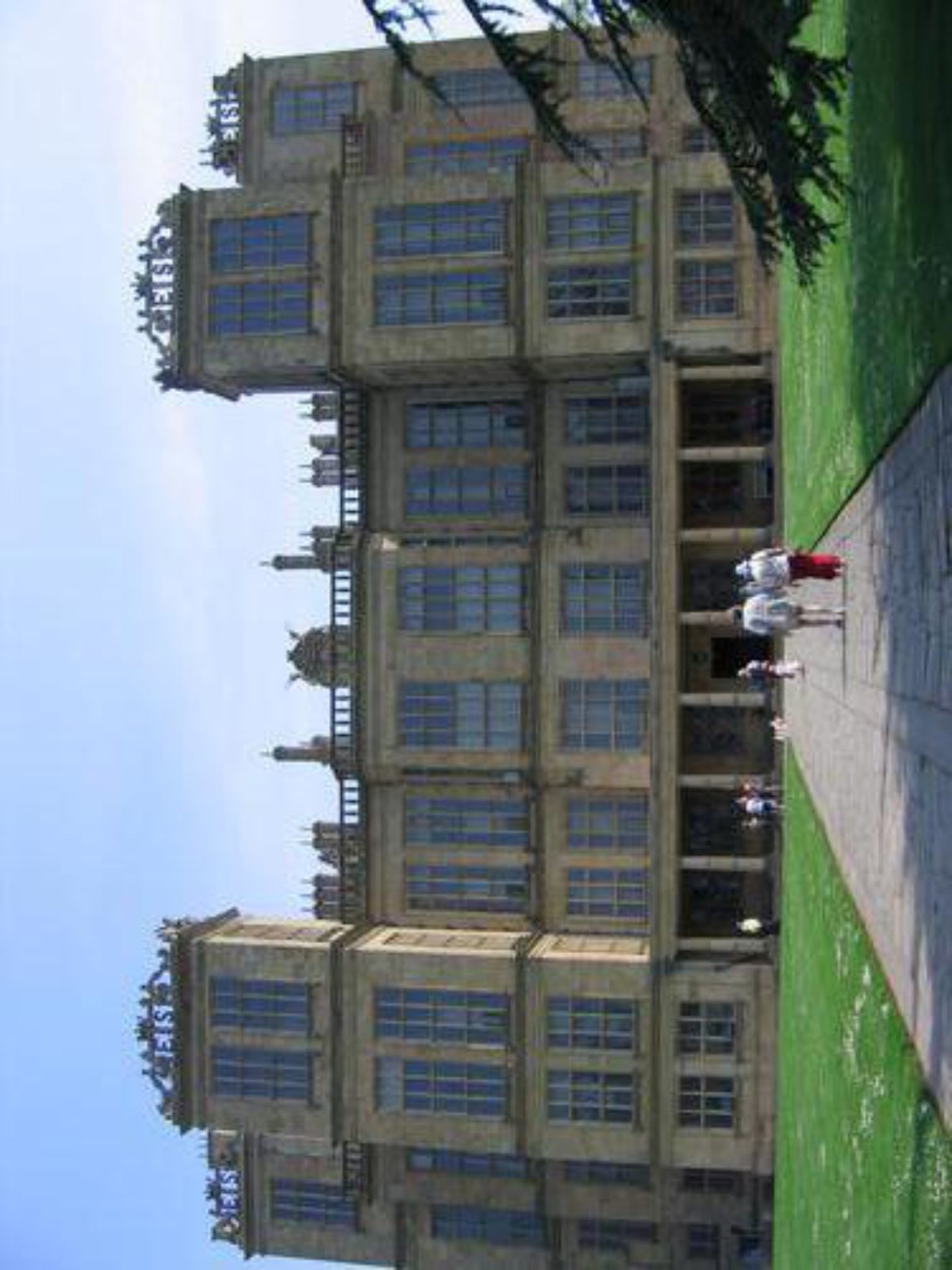 The walled forecourt on the west side of the new Hall is called West Court. A gatehouse is aligned with the west front of the Hall and there are pavilions in the north-west and south-west angles of the forecourt walls, all these structures being crowned with elaborate strapwork cresting. The walls are surmounted by shaped stone crenellations which are not shown on the C17 drawing and may be later additions. The courtyard has a stone-flagged path flanked by lawns between the gatehouse and the entrance to the Hall. A cedar on the side of the path at the west end of the garden was planted c 1837 as one of a pair. An elaborate planting scheme with beds arranged to form the letters 'E S', mirroring the letters on the parapets of the Hall's towers, was laid out in 1833 and is shown in a photograph of 1858. The beds were turfed over c 1921.