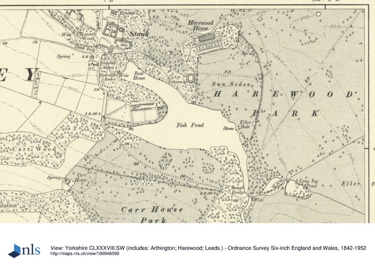 The southern part of the park has extensive areas of woodland around open land called Lodge Hills and Grey Stone Pasture. The Grey Stone (listed grade II), a large gritstone boulder with carvings upon it which are thought to date from c 2000 BC, lies c 1.6km south of the House. Eccup Beck runs across the southern half of the site, through woodland, and continues north to feed the lake.
