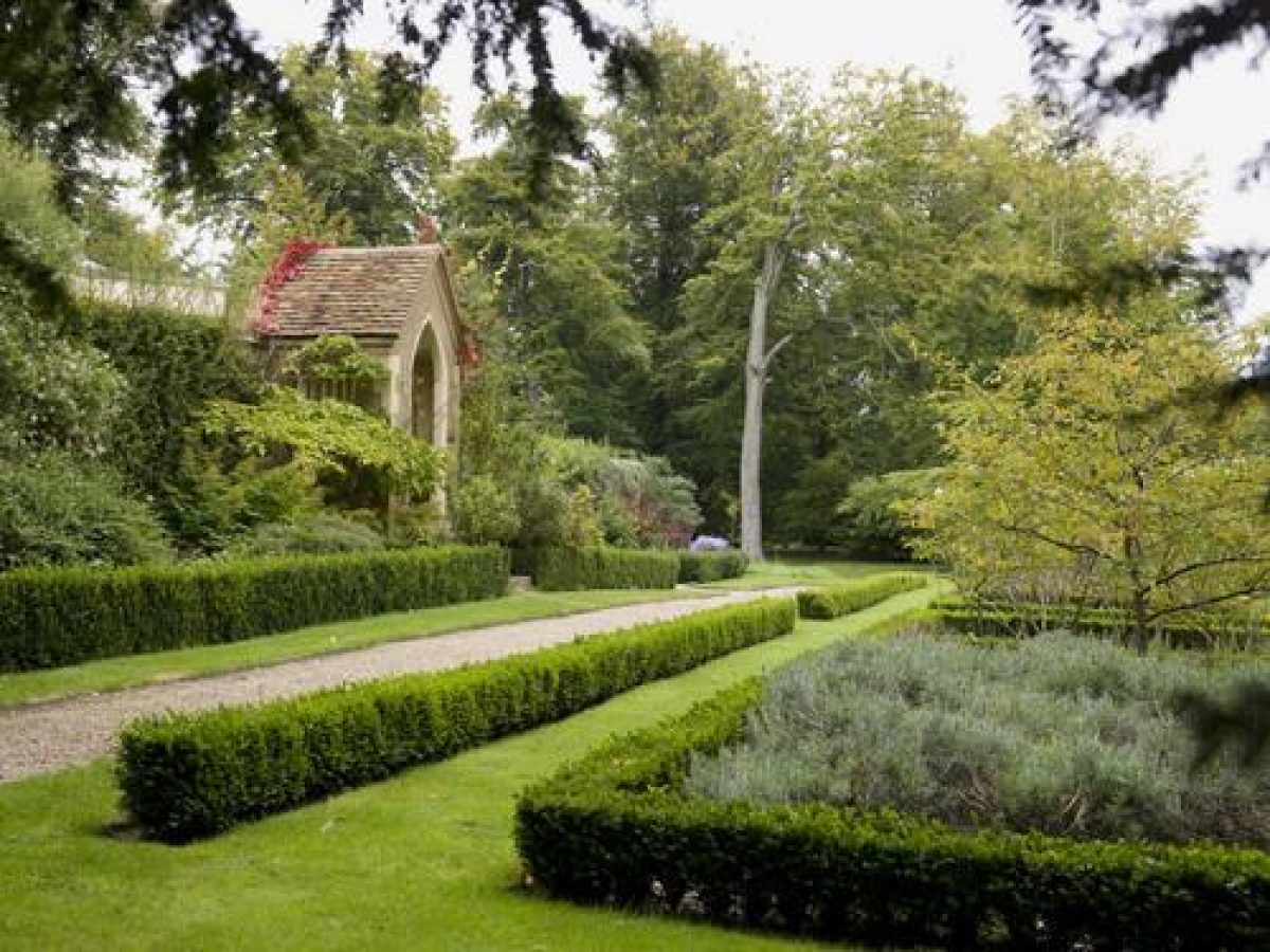 East and south of the house the garden is laid to lawn, with shrub beds and trees. Hartwell was let to the Comte de Provence (later Louis XVIII) between 1809 and 1814, this occupation being commemorated by a group of clipped yews east of the house, originally crown- and mitre-shaped, which survive in modified form. A central circular pond with an island, 75m south of the house, has recently been remodelled and replanted. A ha-ha separates the garden's east and south boundaries from the park. The garden south-west of the house is crossed by paths, with scattered mature trees. A small gothic summerhouse known as the Dairy (C18, listed grade II) is inserted into part of the garden wall south of the stable block. The ha-ha at the extreme south-west garden boundary was moved further south in the 1990s to incorporate part of the park into the garden and create a car park. The new structure contains a sunk fence.