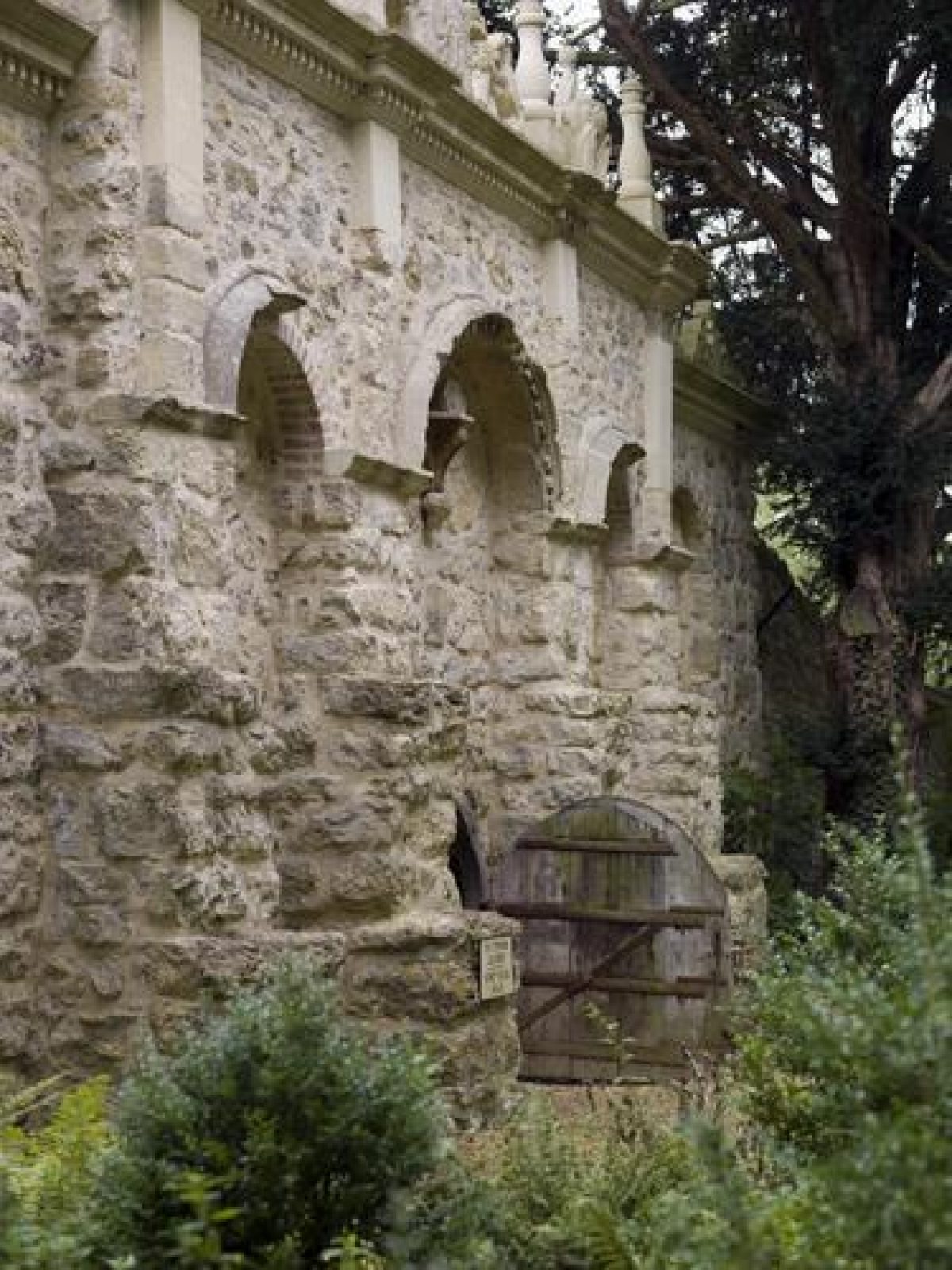 The garden surrounds the house and is largely laid to lawn. Some garden buildings survive from the early C18 formal phase and several have been moved, including Gibbs' rusticated arch, now at the park entrance adjacent to Park Lodge. Those still within the garden include Gibbs' Gothic Tower (James Gibbs 1730, listed grade II) 150m north-west of the house, once part of The Wilderness, and the church of St Mary (Henry Keene 1753-5, listed grade II*). This Gothic-Revival church lies on a mound 75m west of the house in a dramatic position within the landscape, close to the site of an older church. The new church concluded a vista from the house and was aligned on Gibbs' canal temple and Keene's later bridge (both now gone).