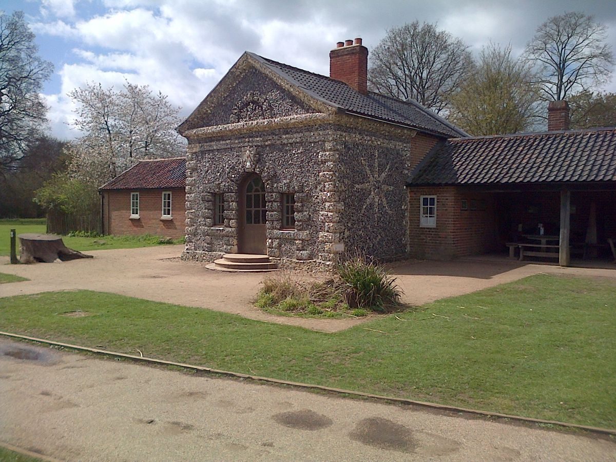 - Description: Single room building on grass lawn beside lake. The exterior is clad with split flints, with radiant sun motifs on the side walls and a peacock motif in the keystone of the door created using shells. The interior ceiling and walls also contain shell decorations. The interior decoration is attributed to Laetitia Houblon, 17 year old daughter of owner of estate, Jacob Houblon III.