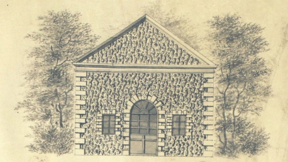 A cottage was also built beside the lake, to which was added a room for picnics, in the form of a Shell House. The exterior is flint clad, with inlaid phoenix and radiant sun motifs created using shells. A survey of the Forest in 1757 by Hollingworth and Landers for Jacob Houblon shows the recently created lake in its original form, and also contains a detailed drawing of the front elevation of the Shell House (but absent the later added shell motifs) (ref: Essex Records Office D/DB P37). The interior ceiling and walls were decorated with exotic shells by Jacob's young daughter, Laetitia. This was probably in 1759, when she was 17. (Lady Alice Archer Houblon, 1907). A letter survives from May 1759, written by Laetitia's brother Jacob, from Naples, Italy, where he was staying whilst completing the Grand Tour. He asks: "How does the cottage go on? What alterations are going on?" (Archer-Houblon family archive, held at the Berkshire Record Office,)