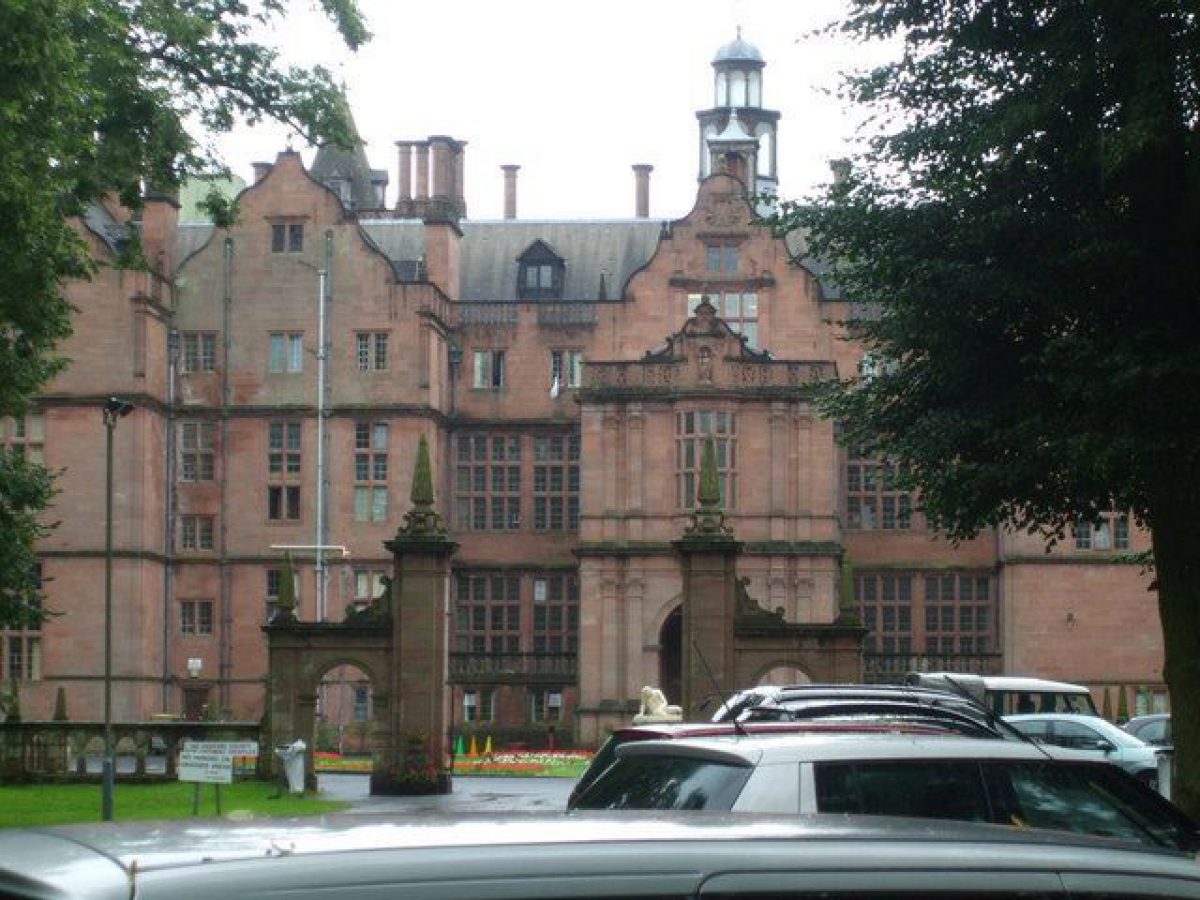 Hewell Grange (listed Grade II*) was built 1884-91 by Bodley & Garner for the first Earl of Plymouth. Of red sandstone, the three-storey house is in the Jacobean style and is said to have been inspired partly by Montacute (Somerset). The entrance front is of nine bays with projecting end bays and a central porte-cochere. On the garden front are two turrets and a centre loggia on the ground floor.