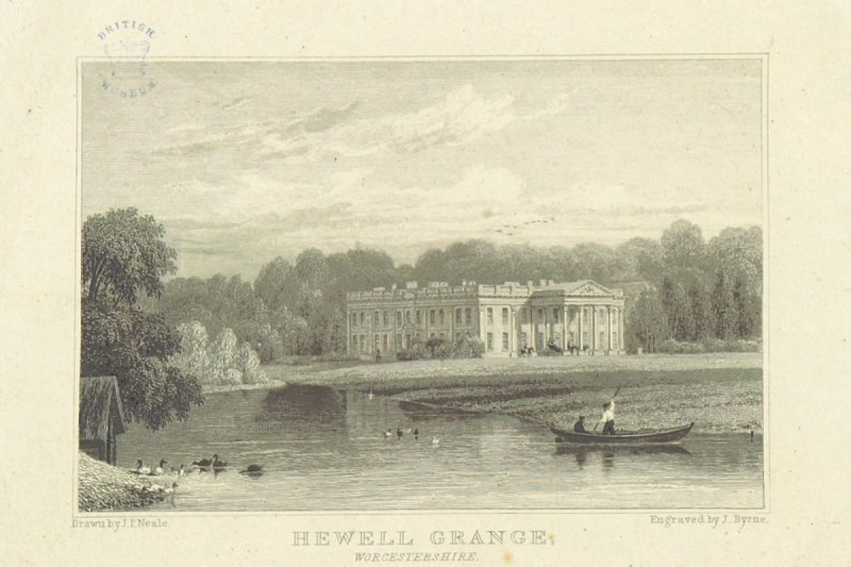 Hewell Grange replaced a square, stone, two-storey building, possibly designed by Francis Smith of Warwick. A huge portico was added in 1816 by Thomas Cundy who also infilled the house's central courtyard, both alterations being among those suggested by Repton in his Red Book of 1812. The shell of that house (listed Grade II), which suffered a major fire in 1889, remains 200m east of the later house, on low ground 100m west of the lake.