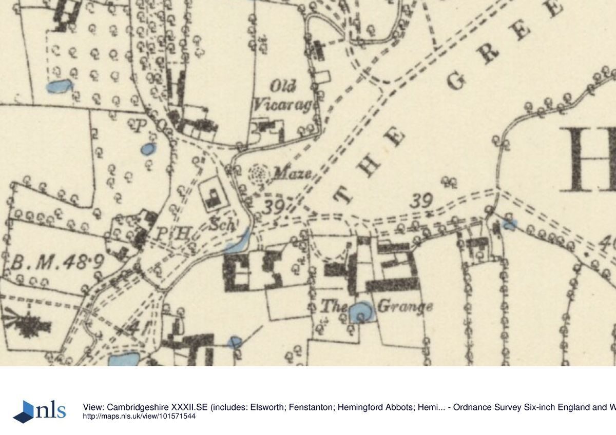 The village of Hilton lies c 12km west-north-west of Cambridge, c 3km to the south of the main A14 Cambridge to Huntingdon road. The village green is situated on the eastern edge of the village, with the maze at its south-west corner, beside the junction of Maze Road and The Grove and bordered to the north by a small stream.