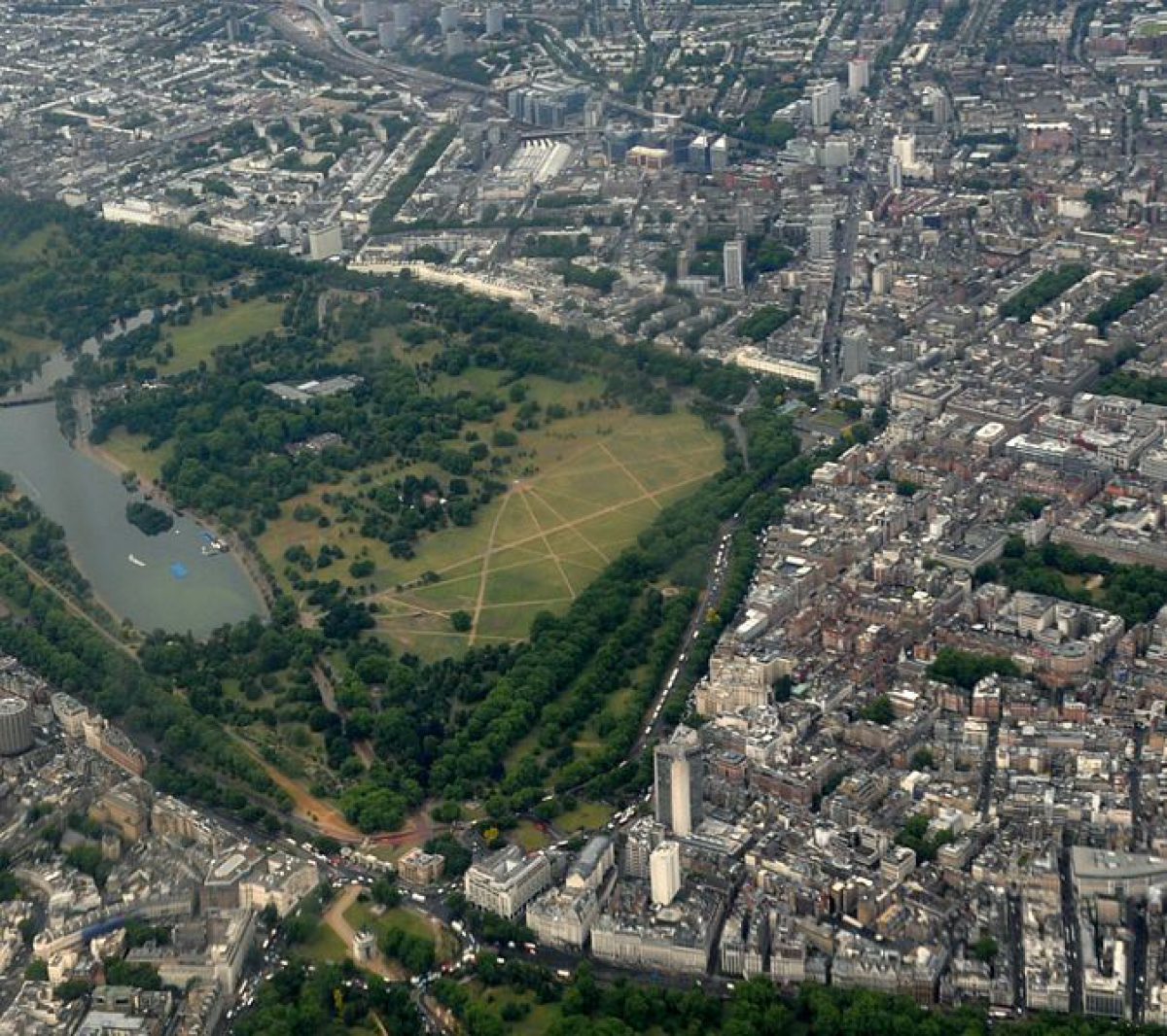 Hyde Park is situated in west London immediately to the east of Kensington Gardens (qv). Regent's Park (qv) is c 1.5km to the north and Green Park (qv) c 250m to the east. The gently undulating c 130ha park falls generally from north to south and is bounded to the north by Bayswater Road. Park Lane provides the boundary to the east and the South Carriage Drive the boundary to the south. Constructed in 1736 as the King's New Road, by 1827 the South Carriage Drive, along with Outer Ring, the East, North, and West Carriage Drives, the Serpentine Road, and the construction of the Serpentine Bridge, provided a circuit of the park. The opening up of new entrances around the perimeter of the park as it became increasingly adopted for use by the public inevitably increased the number of paths. Since 1924 when taxis were first allowed into the park traffic has been on the increase and has also constituted the chief threat to the actual extent of the park. On the east side, Park Lane has been widened several times since the 1860s.