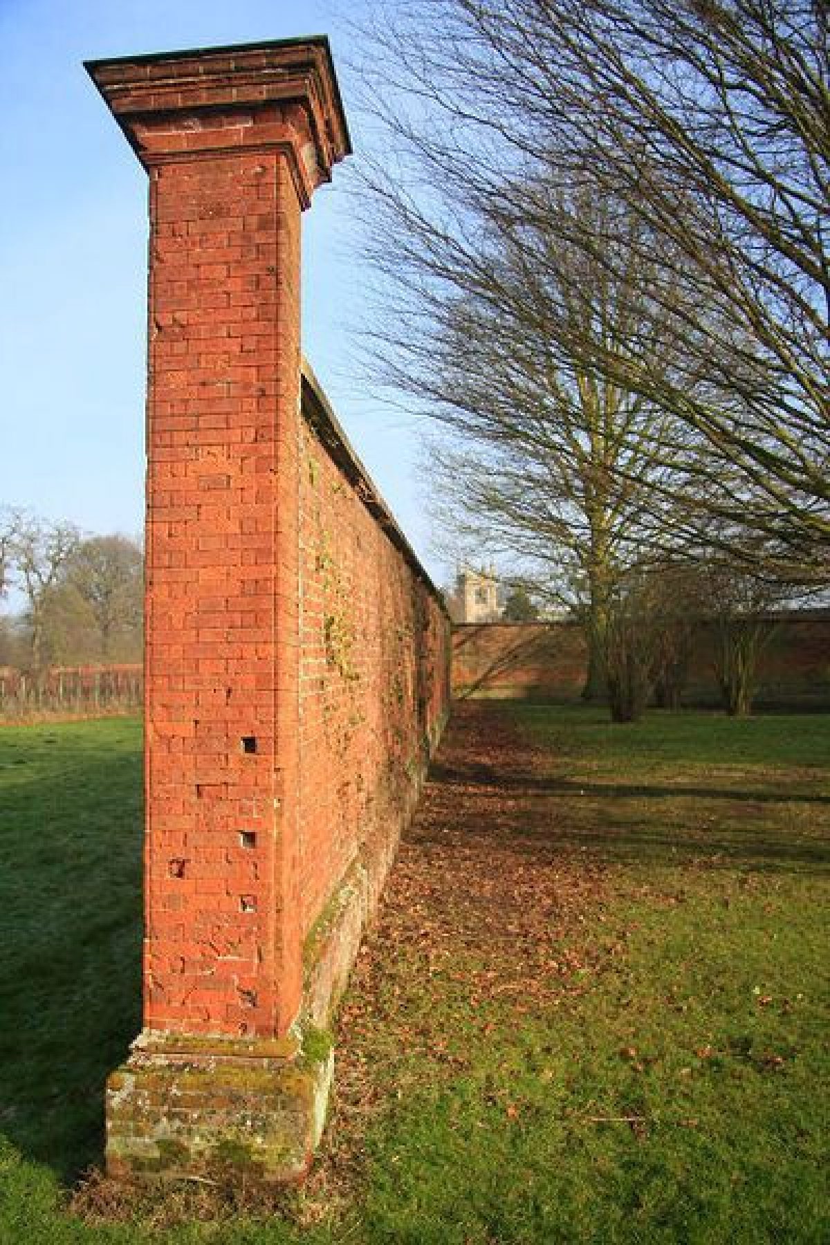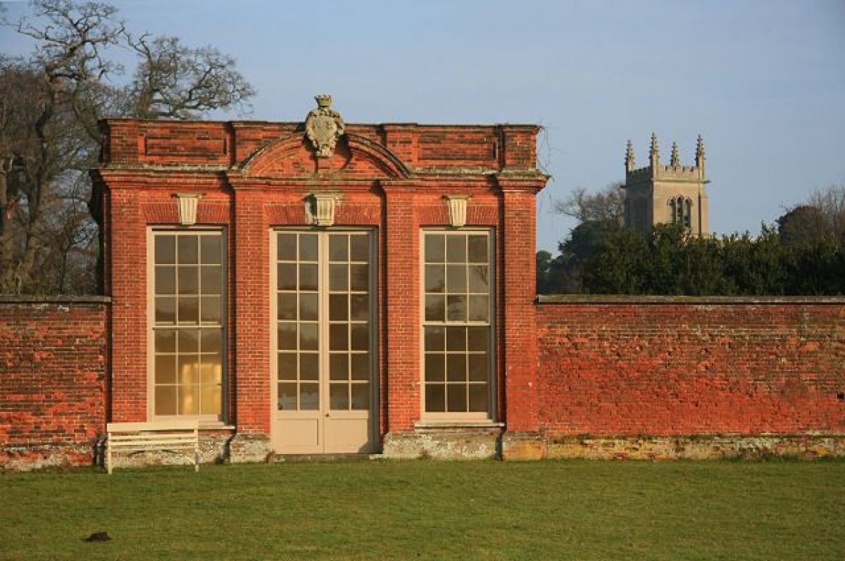 The walled kitchen garden (listed grade II) is situated 500m south-west of Ickworth House on the north bank of the River Linnet. It is enclosed on three sides and open to The Canal on the south side. Within the kitchen garden lie a further two walled enclosures also open to the water, once used as a vineyard. Sir John Hervey's three-bay, single-storey Summerhouse (listed grade II) built in 1703 is situated in the centre of the main garden. It is of red brick with moulded cornice and a parapet which hides a flat roof and it faces south, overlooking The Canal. The Summerhouse is said to have stood in the grounds of the old manor house and was retained as a feature within the kitchen garden (Ickworth Estate, pers comm). To either side are brick walls which return southwards to form one of the inner enclosures. The spaces between these inner enclosures form openings from the body of the garden to The Canal and are said to have been built to draw frost away from the fruit trees onto the surface of the water (Ickworth Estate, pers comm). All the walls are early C18 red brick with C19 concrete copings.