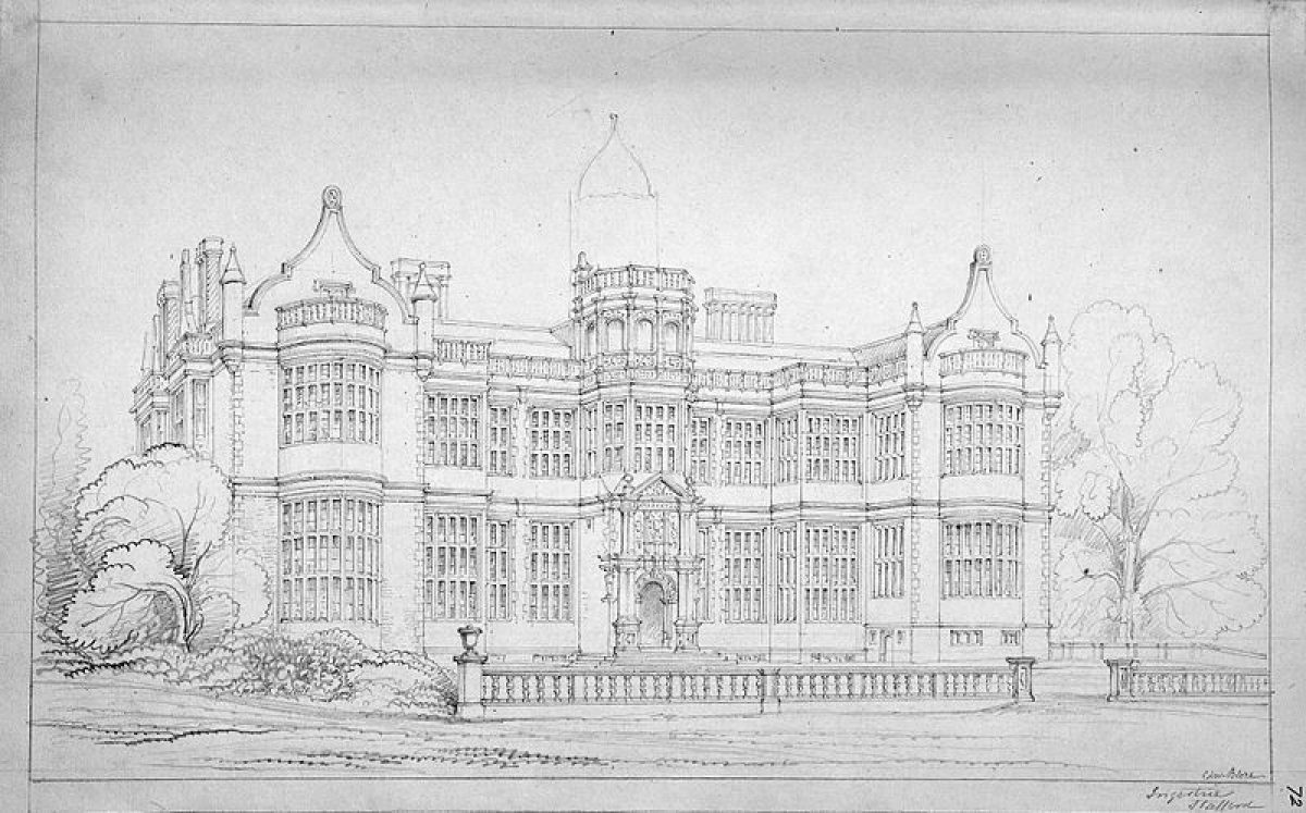 The Elizabethan house was owned by the Chetwynd family, and subsequently the Earls Talbot. In the late-19th-century, the second Earl employed Nash to partly rebuild the house, which was destroyed by fire. A church adjacent to the house dates back to 1673, and is attributed to Wren.