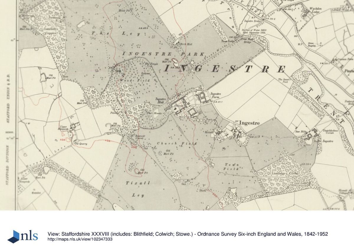 The Victorian terrace is still good though simplified. There is an ornamental walk from the house to the orangery by Samuel Wyatt. It is flanked by trimmed yews and shrubs. The kitchen garden walls remain. Much of the park is in golf use. The rotunda was removed and placed by Tixall church, but the pavilion on the ridge to the west of the house (possibly by Charles Trubshaw) has been restored by the Landmark Trust.