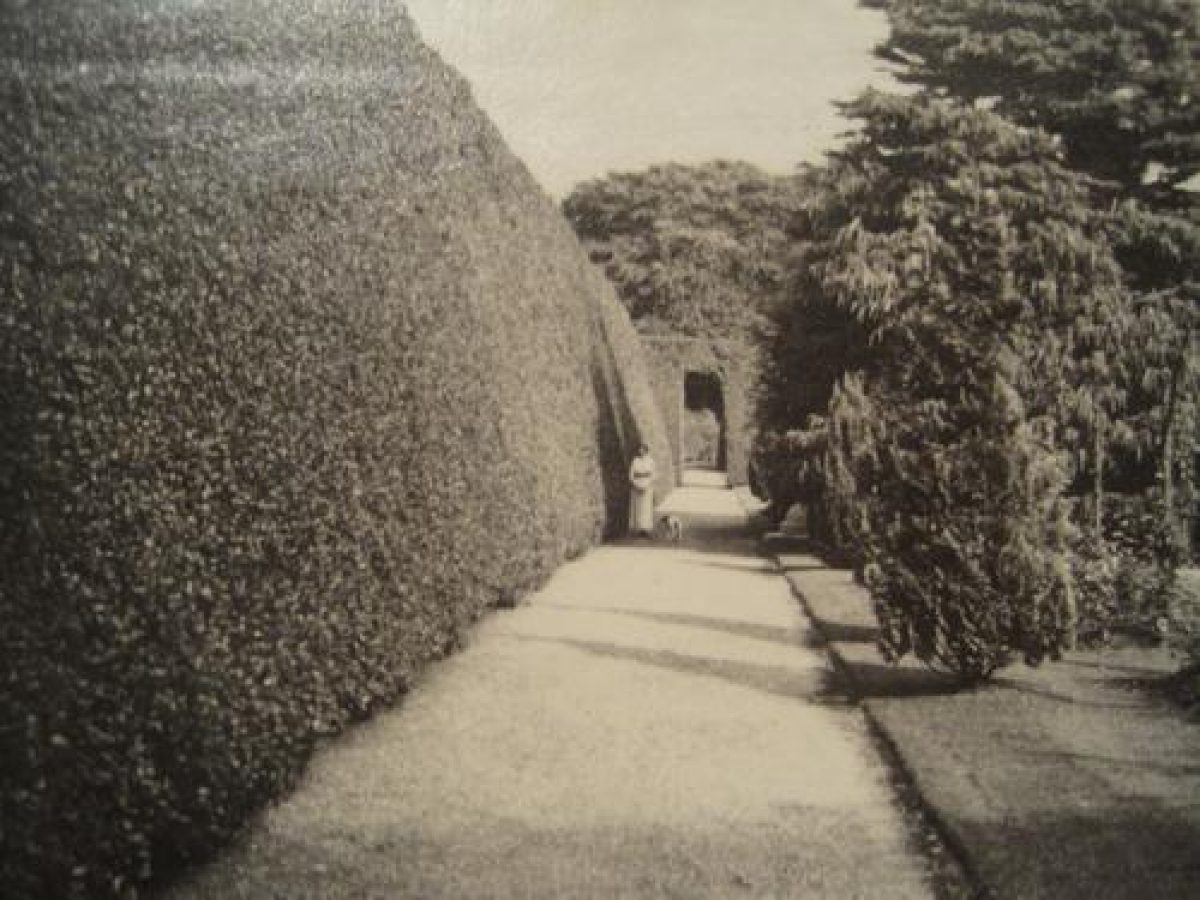 The walk, now past halls of residence, led in the C19 to further pleasure gardens west of the kitchen gardens, now largely occupied by the Sneyd House hall of residence and Larchwood, a group of staff houses. The former stands on the site of an Italianate garden by Nesfield, the only surviving element of which is a stone wall with gateway . The other main surviving element of the pleasure gardens is a tall, east/west holly hedge, probably of 1769, along the north side of Larchwood. At the west end of the hedge in the garden of 21 Larchwood is a south-facing summerhouse lined with Minton tiles, adjoining which to the north is the C19 Holly Lodge and to the west the 'Glazed Gates', tall iron gates on stone piers. Leading south from those gates is a tree-lined drive to Paddock Farm, built as a horse stud in the late C19. The house is bungalow-style and late C19; most of the agricultural buildings are large cattle sheds of the late C20.
