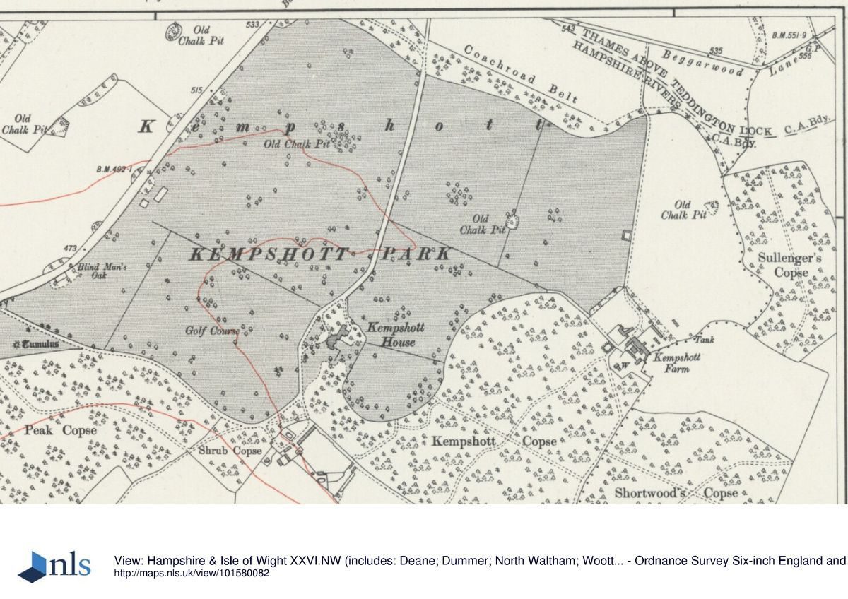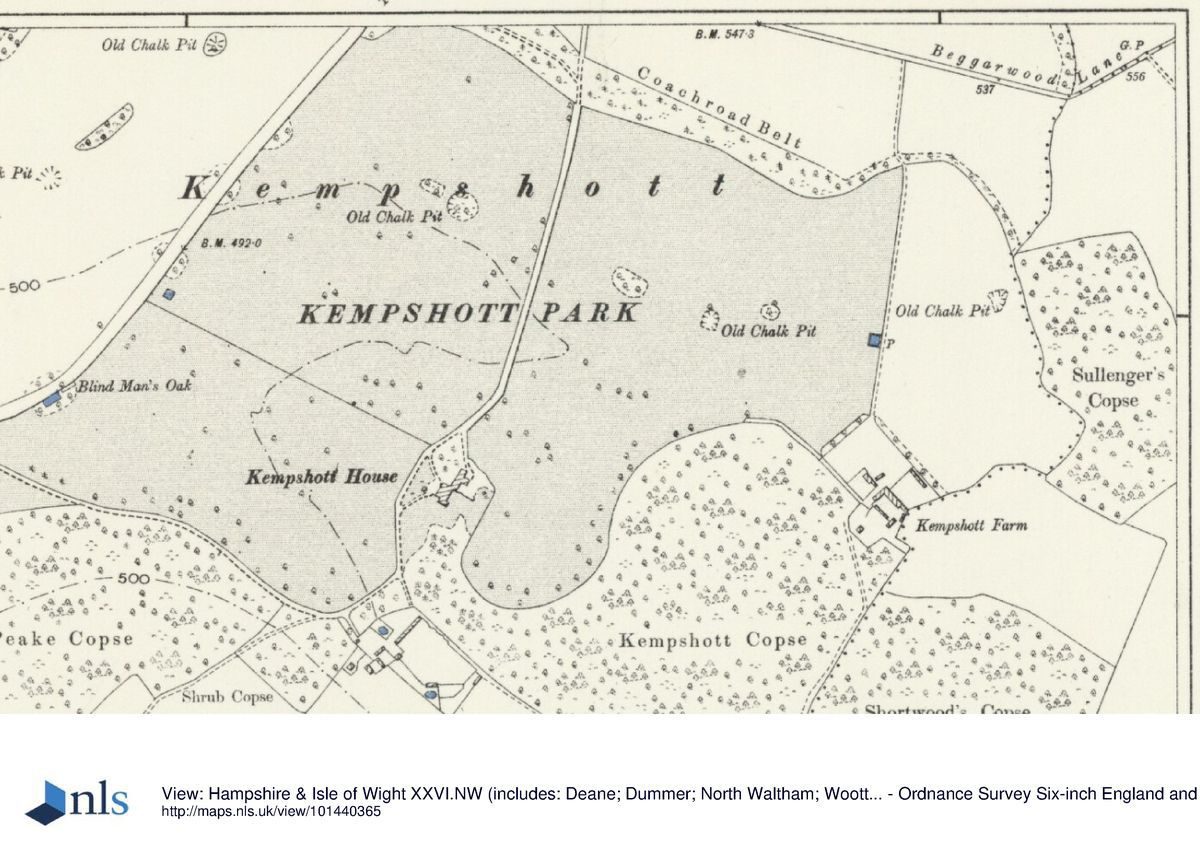 The manor of KEMPSHOTT (Campessete, xi cent.; Campeshet, Kempeschete, xiii cent.; Kembeshete, xiv cent.; Kempshote, xv cent.), which had belonged to Aldret in the reign of Edward the Confessor, formed part of the possessions of Hugh de Port in 1086, being held of him by Walter. There is no reference to emparkment at this time. Saxon's map of 1575 records the presence of the hamlet and from 1600 Kempshott was the residence of the Pincke family. In 1770 the estate was sold to Phillip Denhay of Farleigh Wallop, who pulled down the old manor house and built a large brick mansion on the site. In 1787 it was sold to James Morley, and then in 1789 to J.C. Crook of Stratton. (indicated on Milne's map)