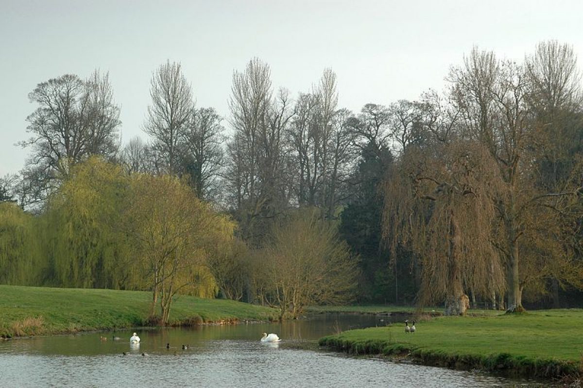 The undulating park, probably laid out by Lancelot Brown in the mid C18 (Stroud 1975), encloses the Hall, gardens and pleasure grounds, and is dominated by the serpentine lake formed from the River Glyme which bisects it. It is laid largely to pasture and contains areas of woodland, together with clumps of mature trees and single specimens, including several mature cedars. The hillside below the main terrace adjacent to the Hall slopes down to the west and south, to the northern edge of the lake. The ground is smoothly contoured, with the Hall sitting on the plateau at the top with views down to the water. A further lake, formed in the mid C20, lies to the north of the footbridge across the north end of the main lake.