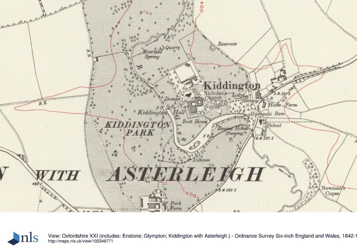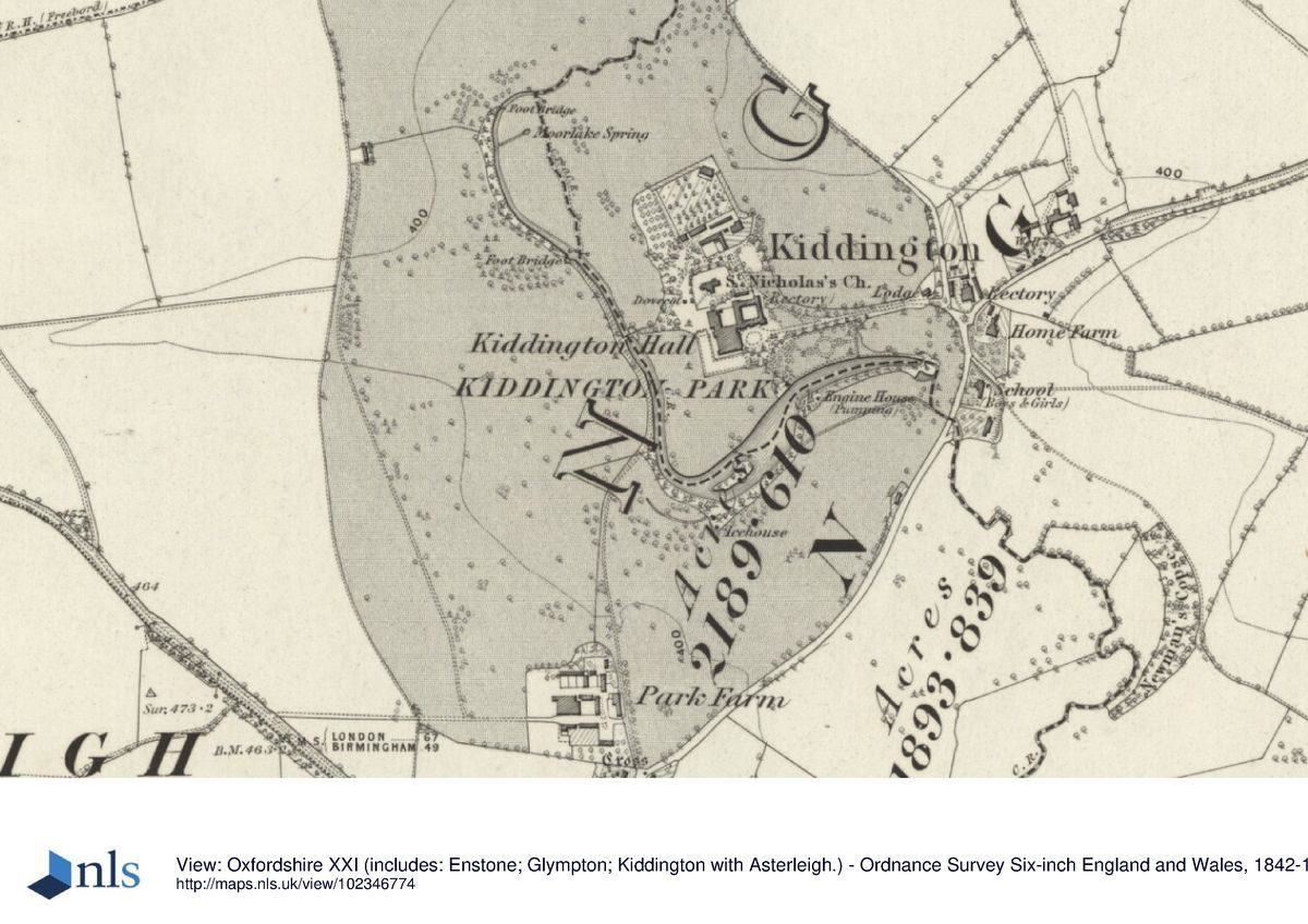 Kiddington Park lies c 7km north-west of Woodstock, at the west edge of Kiddington village, sited on hilly ground bisected by the valley of the River Glyme which enters the site at the north boundary and leaves at the east. The c 75ha site is bounded largely by agricultural land, the boundary marked to the south-east by the lane between Over Kiddington and Kiddington, and to the north-east by the lane from Kiddington to Radford. The setting is agricultural and wooded, with several hamlets close to the park, and views extending south-east and west out of the park. Kiddington lies at the centre of a group of landscape parks including Sandford Park (qv), Ditchley Park (qv), Glympton Park and Blenheim (qv).