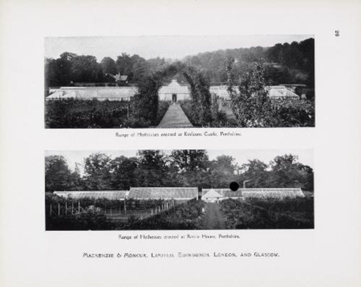 The kitchen garden is situated south of the Castle and east of the Home Farm. The exact date of its construction is uncertain; one account describes notes of its construction dating from the 1820s whilst another states that a plan exists for the layout of the glasshouses which dates from 1807. The 1841 account describes the walls as being covered in fruit trees and notes that there were 'a few herbaceous plants but not many American or other exotic trees or shrubs'. The 1st edition OS map indicates the layout of the garden on plan; the square enclosure was divided typically into four equal compartments by intersecting paths but the main feature, a fountain, was sited on the north side of the garden, adjacent to the glasshouses. The garden was maintained at least up until 1930. Private houses have since been developed within and adjacent to its boundaries. The ornate gates remain in the north wall. F.W. Deas designed an arbour for the garden.