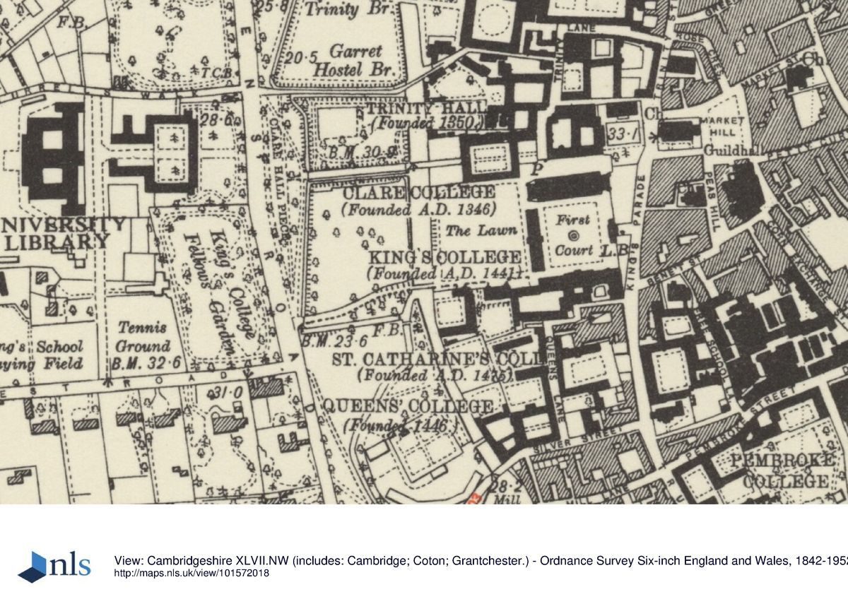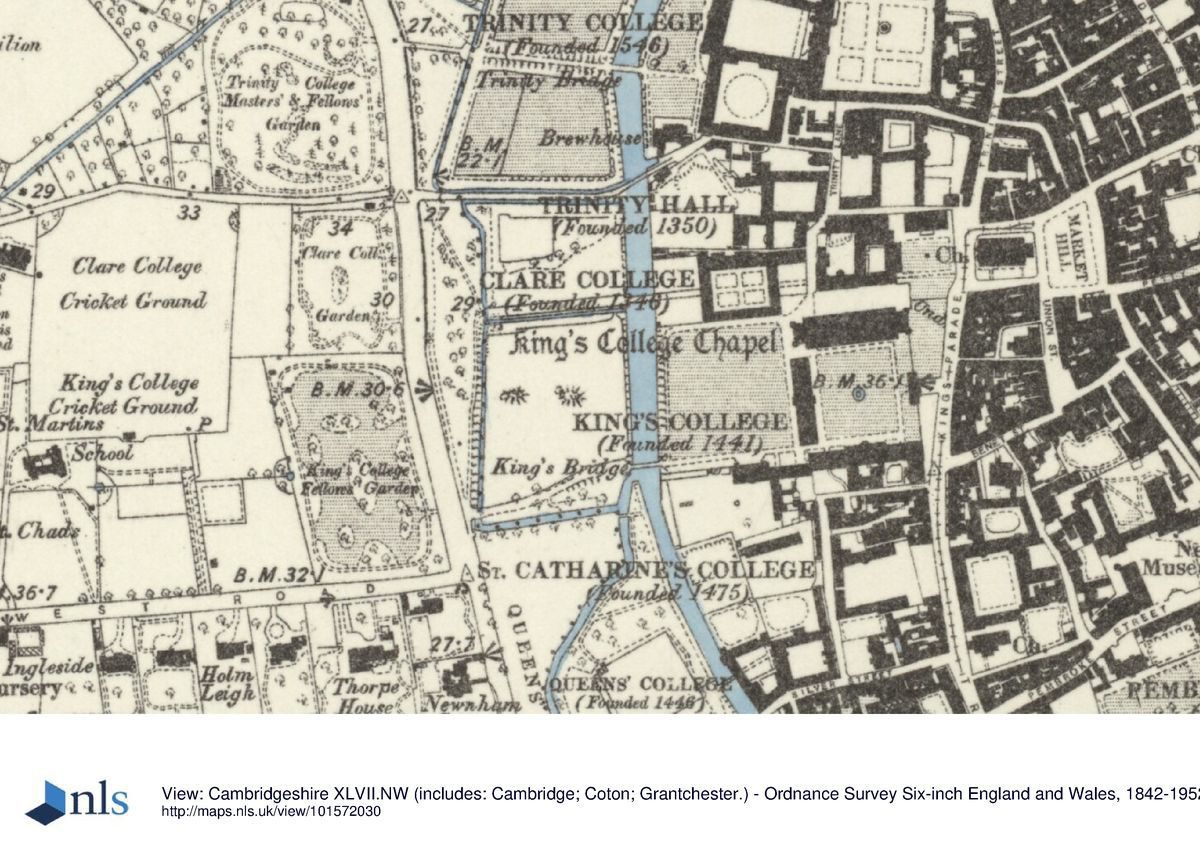 King's College was founded by Henry VI in 1441. Loggan's map of 1688 shows the college hidden behind buildings along Trumpington Road. King's Bridge built in 1627 crossed the river mid-way between the boundaries of Queens' and Clare Colleges.