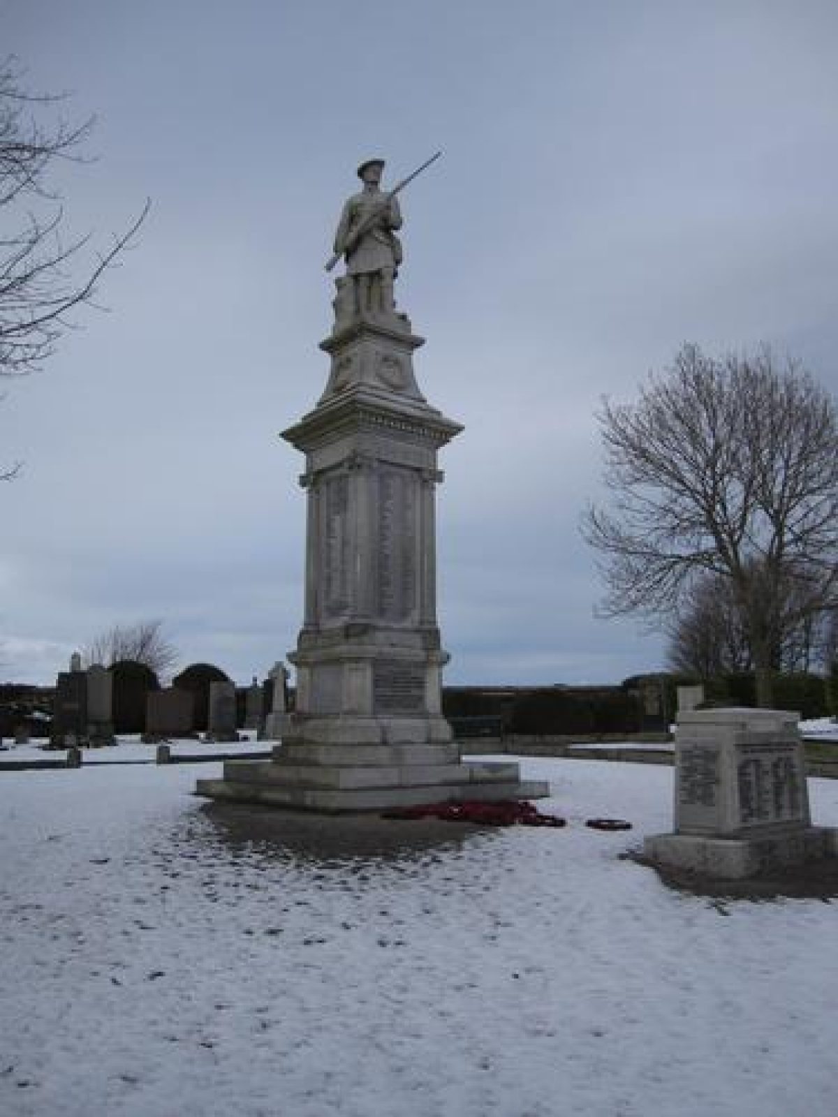 At the north end of the site is the war memorial, erected after the World War 1. It is of grey granite and shows a Highland soldier in combat dress including a rifle. A smaller inscribed stone carries the memorial for 1939-45. The cemetery also contains the family grave of J M Barrie, novelist and playwright. In 2010 this was surrounded by a low grey granite wall.