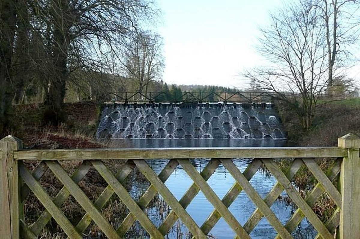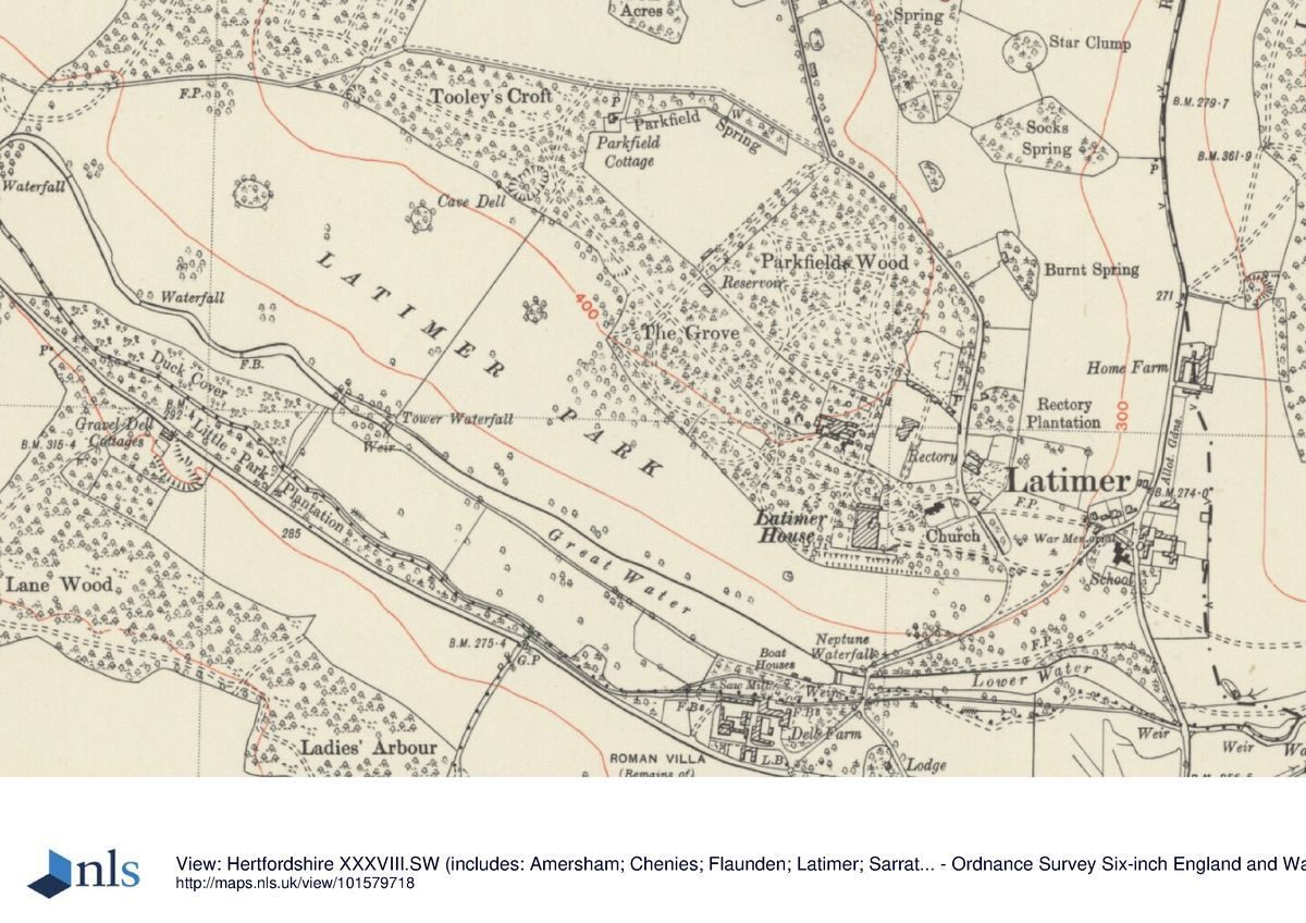 The ground falls steeply south from the house down to the Great Water and Lower Water. Although not shown on Benjamin Capel's map of 1785, these lakes were formed in the 1750s by the damming of the River Chess. The water is held by a great dam, the Neptune Waterfall, which occupies the site of an earlier mill, the level of the Lower Water being significantly below that of the Great Water. A series of five smaller weirs span the river as it runs through the park, of which the Tower Waterfall, marking the western end of the Great Water, is the most significant. The Tower, a folly which accompanied the waterfall, and the Cave, another folly which stood at the west end of The Grove, no longer exist. Hardly surprisingly, nor does the 'Dutch Yacht' which John Lewis, shipwright, was employed to look after. Following the creation of the Water, the mill was beautified on the park side, given a flag-staff, and named 'Latimer Castle', but on the creation of the cascade the building was found to be in the way and in 1763 it was demolished.