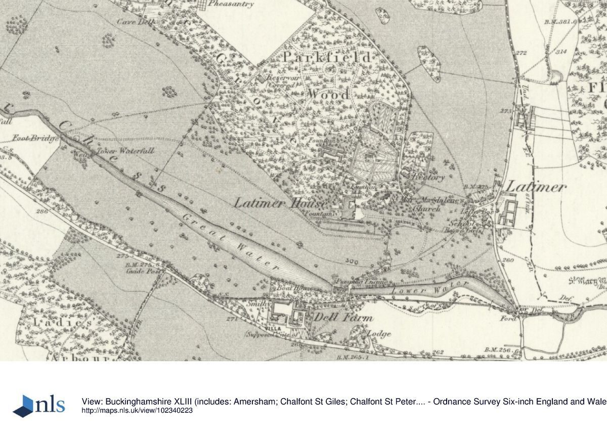 The park was enlarged when the lakes were formed, the fields and meadow land above the mill being imparked at this date. George Johnson in his History of English Gardening (1829) praised the design as the work of Lancelot Brown (1716-83) but there is no other evidence to support this. Much of the land is now arable and most of the specimen trees which stood along the banks of the lakes have gone. The park stretches along both sides of the river valley, with woodland closing the skyline on the south side. The Latimer Road runs through the park, parallel to the river. It originally ran to the north of Dell Farm but was diverted round its south side in 1834.