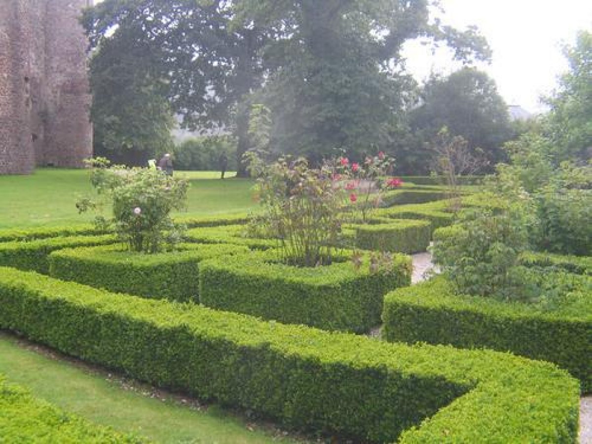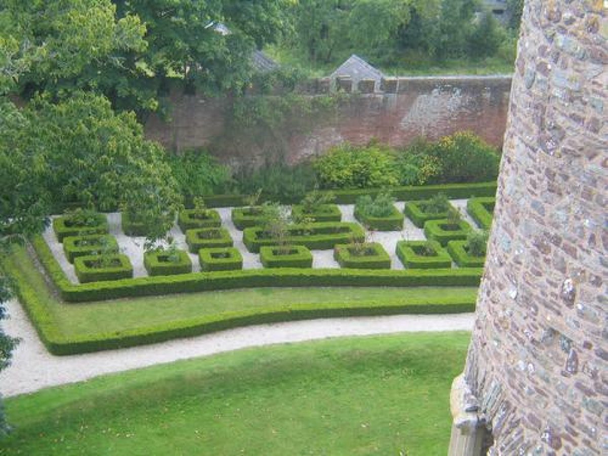 The main garden, in the outer ward, was restored and replanted by CADW in the early-1990s within its early-19th century layout.
