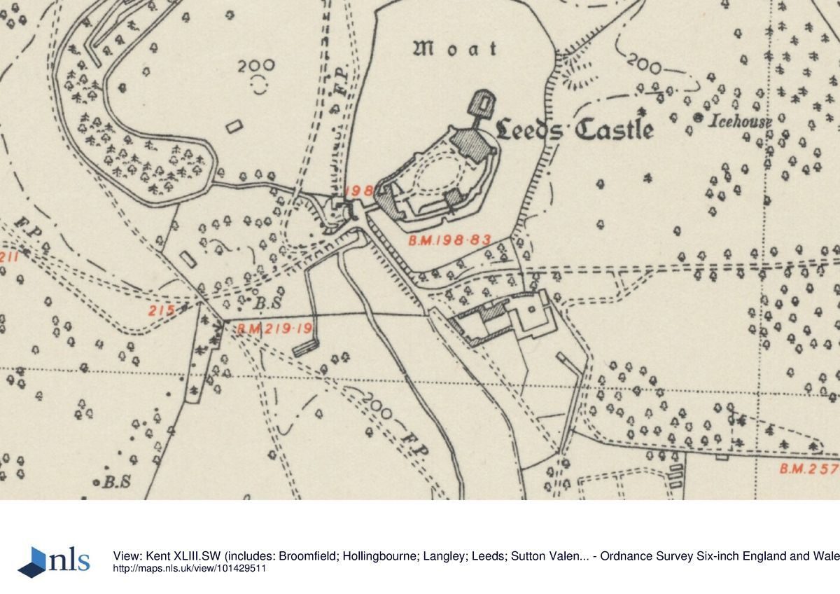 The present main vehicular entrance to the Castle, which is also the public entrance, is from the B2163, 230m south of its junction with the A20. This entrance was created in the late C20, with the addition of the brick gate piers in the late 1980s. The drive runs due east before joining a drive running south from an entrance off the A20, shown established on Thomas Hogben's map of 1748 and flanked by twin, two-storey stone lodges (built to designs by Owen Little FRIBA in the 1920s, listed grade II). The drive follows a straight south-easterly course for c 950m, passing after 250m the present ticket office and shop buildings, from which a footpath leads visitors southwards to the Castle along the river valley. The drive turns southwards along the west side of the moat, crossing the narrow channel of the River Len on a stone bridge. It then loops north-eastwards and crosses the dam controlling the south end of the moat which is guarded by the remaining walls of the C13 Inner and Outer Barbican, the latter incorporating the ruins of a pre-1086 mill and constructed originally with three gates to serve approaches from the north-west, west, and south-east (dam and Barbican ruins listed grade I). Approaches from these directions appear to have been in continuous use from the C13 and are shown on Hogben's map (1748), the present drive following the north-west approach shown lined with avenue trees along the first 600m from the A20 (these had gone by 1865-6, when the OS 1st edition was surveyed). The present entrance from Broomfield Road is flanked by twin lodges (Owen Little, listed grade II) of similar appearance and date to those on the A20.