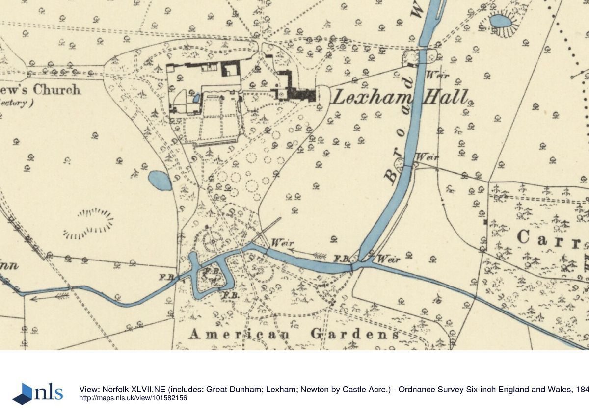 The park is laid to pasture with a generous scatter of trees, predominantly oak with lime and sweet chestnut of mixed ages. Some very mature oaks in the north park are most probably pre-park boundary trees. The River Nar cuts through the south park from east to west and broadens at the western end in two sections to create a lake. Running north from the lake, c200m from the house, is the Broad Water, a canalised spur off the river which runs for 800m through the park and crosses the East to West Lexham road into a small section of open parkbeyond.