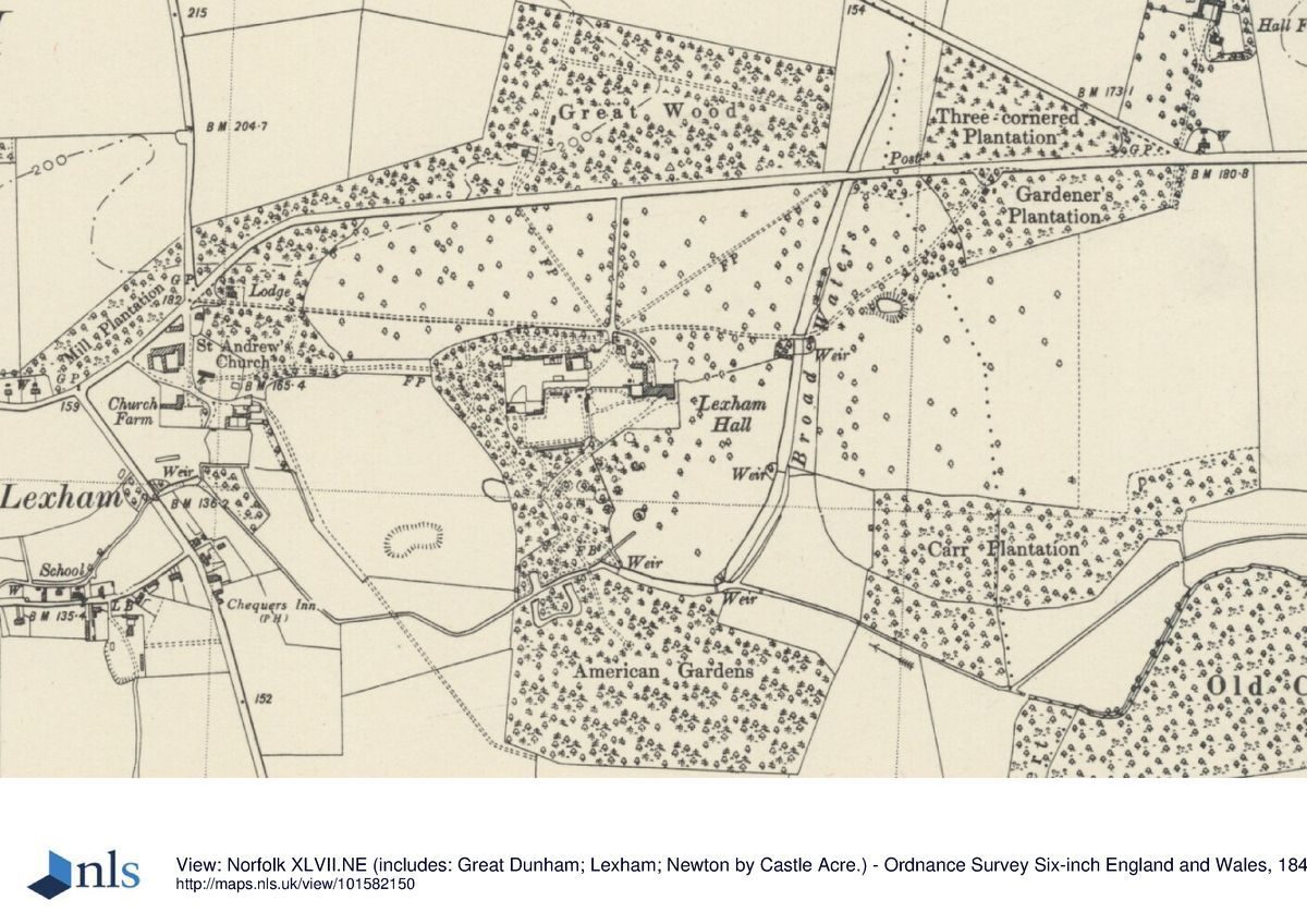 The first manor house at Lexham was built in the 1630s for John Wright and was acquired by the Wodehouse family of Kimberley Hall (see description of this site elsewhere in the Register) in 1673, together with the surrounding estate. During the early 18th century Edward Wodehouse extensively remodelled the house and built a walled kitchen garden, part of which survives. In 1776 Sir John Wodehouse carried out further improvements to the Hall, enclosed and laid out the park, and developed gardens and pleasure grounds to the south. John Hyde leased the estate from 1795 and eventually purchased it in 1801, selling on to Colonel F W Keppel in 1807 who extended the park and commissioned Jeffry Wyatville to enlarge the Hall. During the latter part of the 19th century the park was further altered, expanding slightly to the east (OS 1891). In 1911 the estate was sold to the Jessop family who developed the farming side of the estate and in 1941 sold it to Olaf Kier, a Dane who intended to settle at Lexham after the war. During the war the house and park were occupied by the army; park trees were lost, the gardens suffered extensive damage and the Hall fell into disrepair. Consequently Kier put the estate back on the market and it was purchased by William Foster in 1946 who restored the house with the help of architect Jim Fletcher Watson. The site remains (1999) in private ownership.