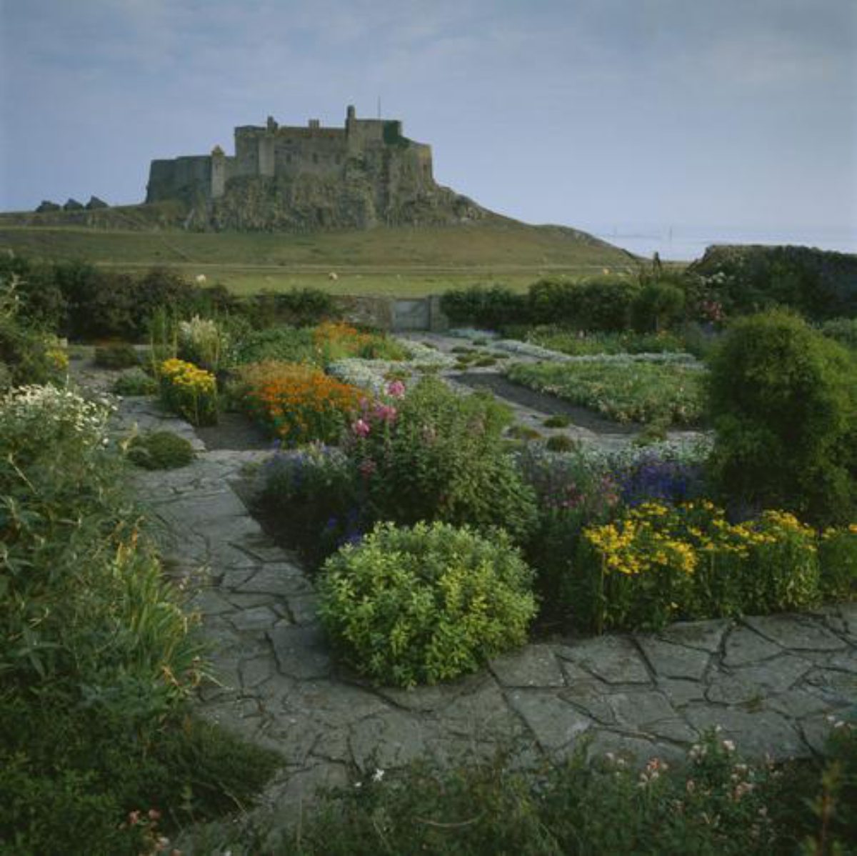 Lindisfarne Castle is perched on a rocky island crag which is accessible only by causeway. It has an associated walled garden by Edwin Lutyens. Gertrude Jekyll carried out the planting plan which has been restored by the National Trust.